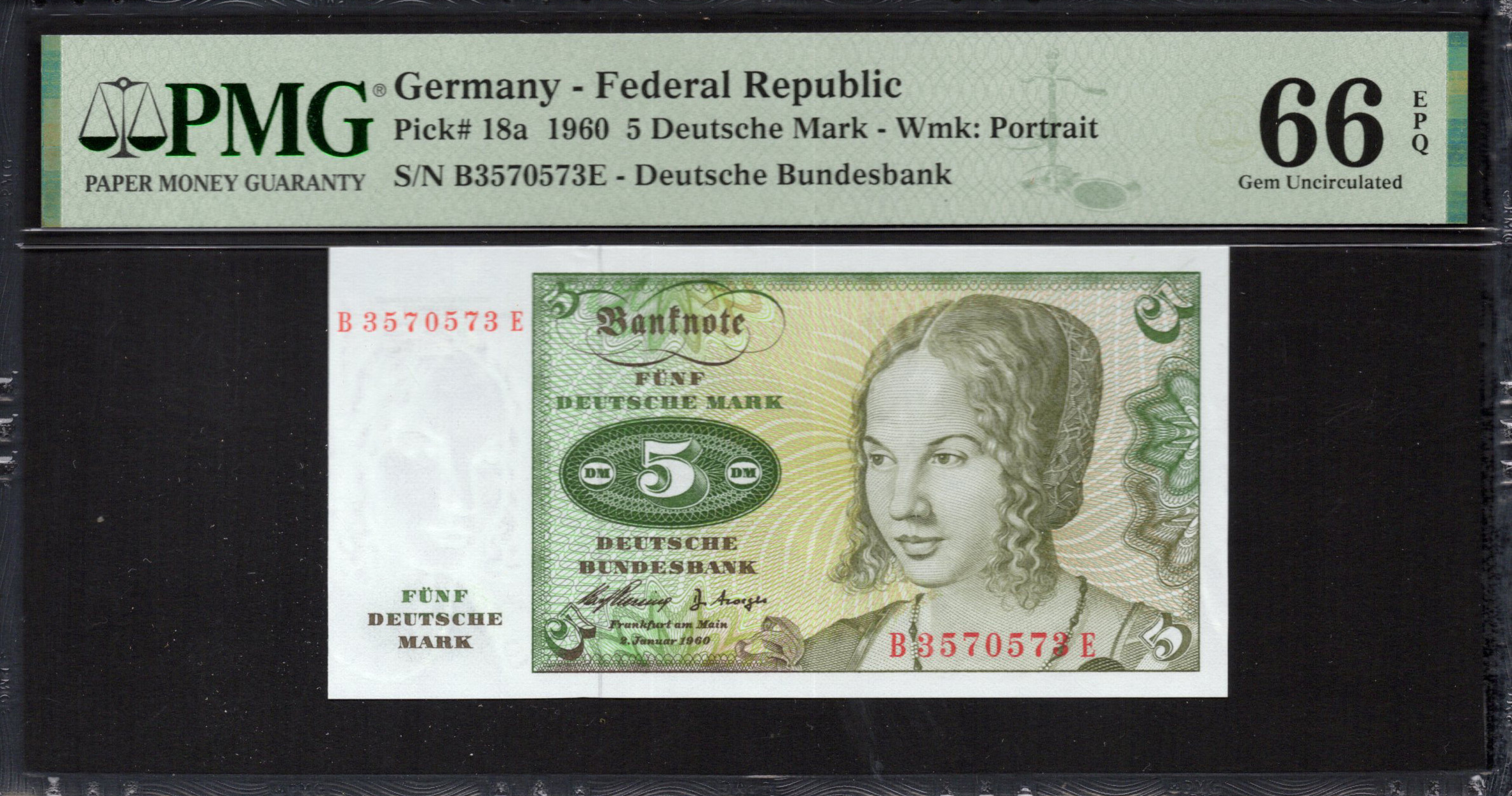 Germany - 5 Deutsche Mark 1960 - Pick # 18a - PMG 66 EPQ