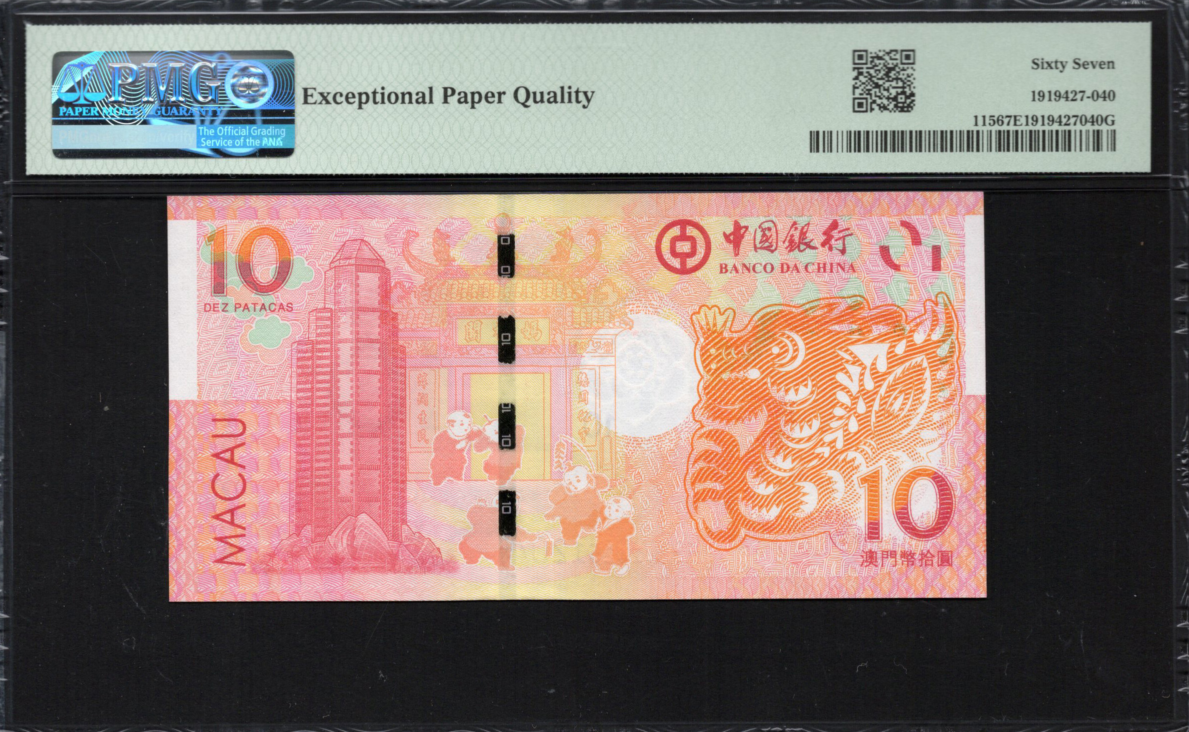 Diese 10 Patacas Banknote aus Macau, Teil der Serie 'Jahr des Drachen', zeigt lebendige Elemente, die kulturelle Bedeutung und künstlerisches Design widerspiegeln. Die Vorderseite zeigt einen Drachen, ein Symbol für Macht und Stärke in der chinesischen Kultur, umgeben von komplizierten Mustern in Rottönen und Gold. Die Rückseite hebt den Nennwert '10' hervor und enthält komplexe Designs, die repräsentativ für die Region sind. Sicherheitsmerkmale gewährleisten die Echtheit und machen diese Banknote nicht nur zur Währung, sondern auch zu einem Sammlerstück.