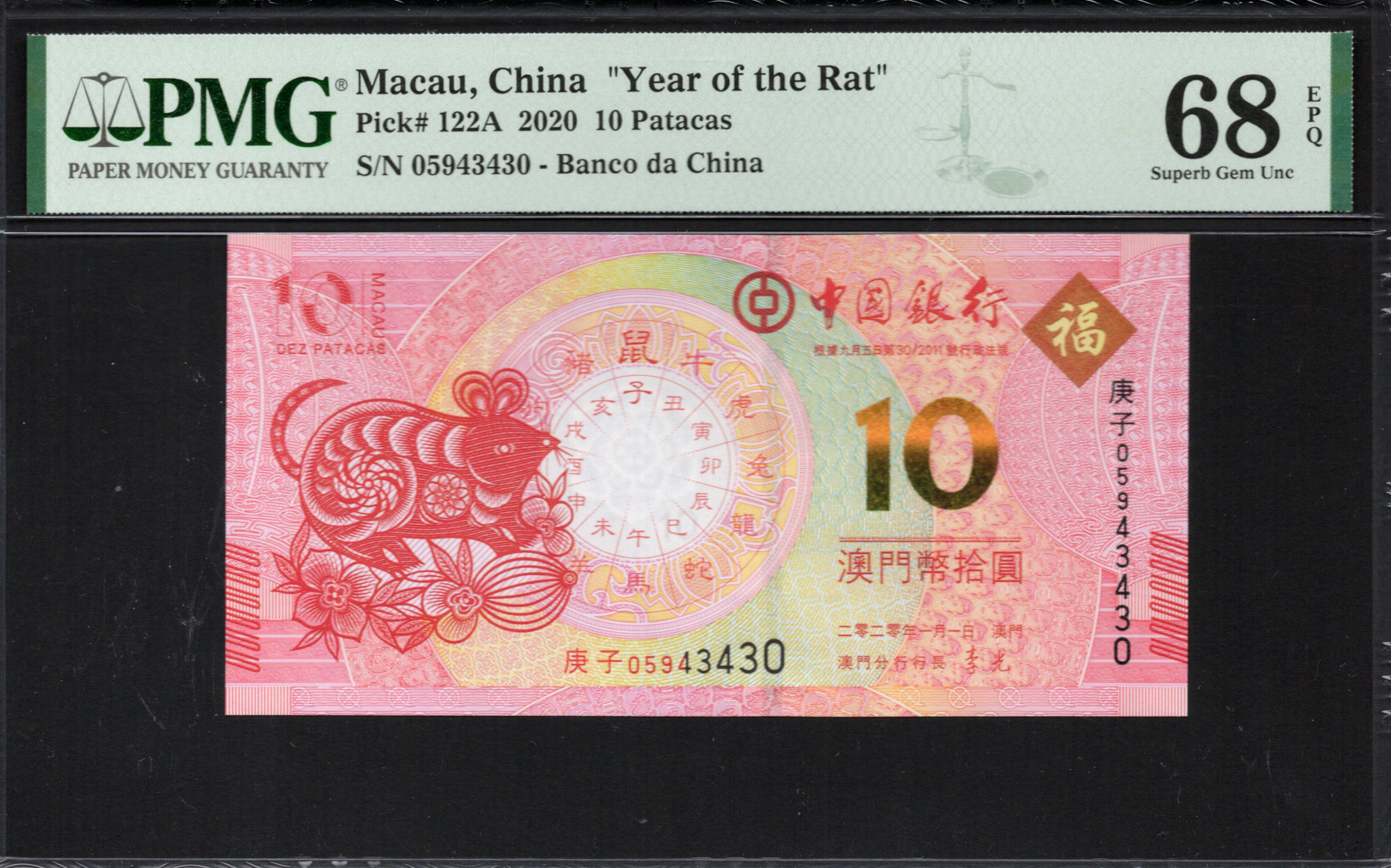 Die 10 Patacas Banknote aus Macau, die 2020 ausgegeben wurde, feiert das "Jahr der Ratte" und zeigt aufwendige Designs, die kulturelle Elemente der Region widerspiegeln. Diese farbenfrohe Note zeigt eine lebendige Darstellung einer Ratte, umgeben von ornamentalen Blumenmustern. Mit ihren lebendigen Farben und verschiedenen Sicherheitsmerkmalen bietet sie eine interessante Studie über Kunst und Währungsdesign.