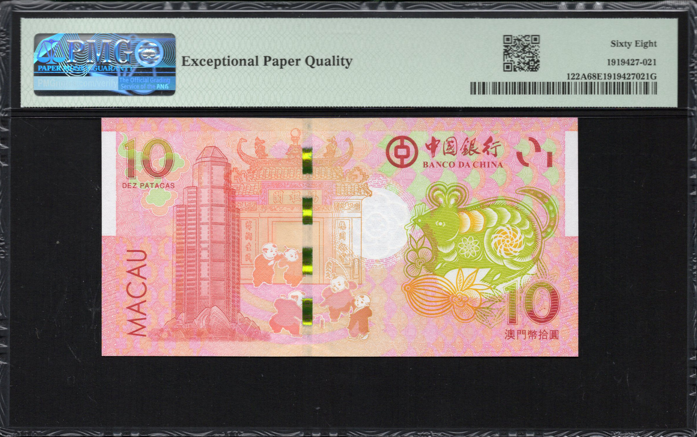 Auf der Rückseite der 10 Patacas Note findet man eine harmonische Mischung aus Farben und Mustern. Das Design enthält zusätzliche chinesische ornamentale Elemente, die das kulturelle Erbe von Macau betonen. Die goldene '10' sticht hervor, und der Hintergrund hat komplizierte Muster, die holographische Elemente zur Sicherheitsverstärkung einschließen. Text in traditionellen chinesischen Schriftzeichen ergänzt den dekorativen Stil, wodurch die Note nicht nur ein Zahlungsmittel, sondern auch ein Kunstwerk ist. Sicherheitsmerkmale wie ein transparentes Fenster und aufwendiger Druck auf der Rückseite unterstreichen die Bedeutung von Sicherheit im Währungsdesign.