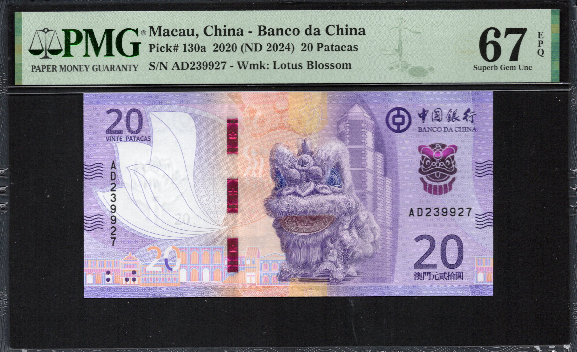 Die Vorderseite der 20 Patacas Note zeigt prominent den Nennwert '20' sowie die Worte 'Vinte Patacas'. Der Hintergrund zeigt eine schöne Lotusblume in einem sanften Pastell-Lila, die Reinheit und Ruhe symbolisiert. Links fügen komplizierte Wellenmuster Dimensionen hinzu, während eine Abbildung eines Löwentanzes zu sehen ist, die die kulturelle Bedeutung unterstreicht. Verschiedene Sicherheitsmerkmale wie Mikroschrift und ein detailliertes Wasserzeichen erhöhen die Authentizität und machen sie nicht nur zu einem Zahlungsmittel, sondern auch zu einem Kunstwerk.