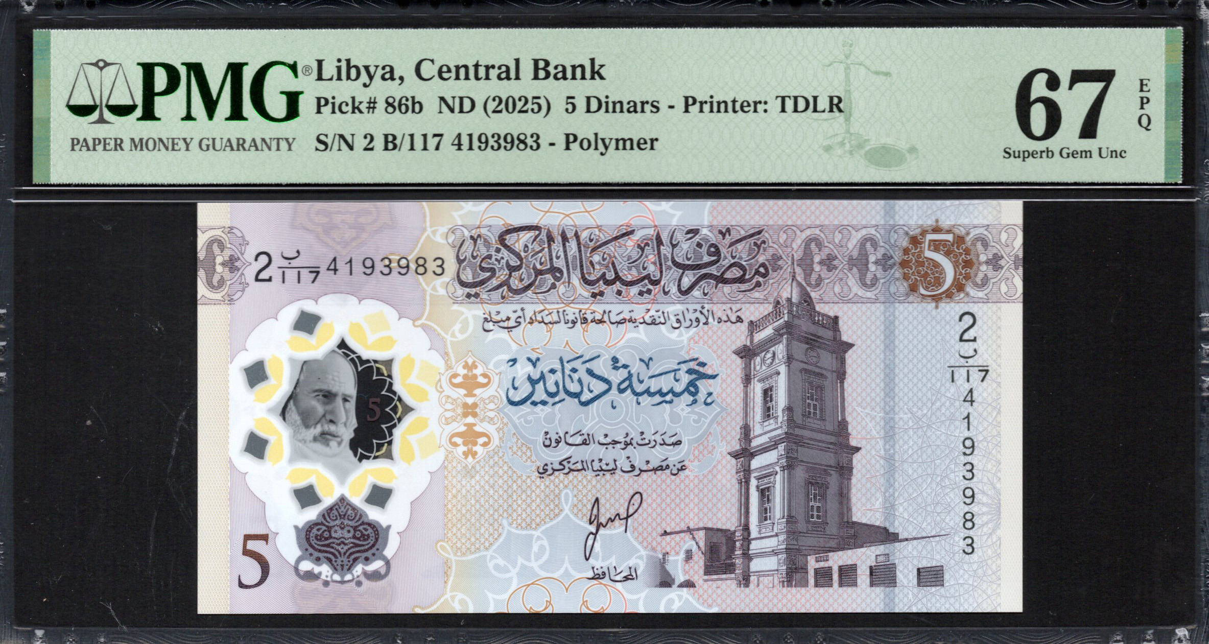 Die 5 Dinar Banknote der Zentralbank Libyens präsentiert kunstvolle Designs und lebendige Farben, die das kulturelle Erbe Libyens widerspiegeln. Die Vorderseite zeigt ein Porträt einer herausragenden Persönlichkeit, umgeben von filigranen Mustern und stilisierten Darstellungen wichtiger architektonischer Wahrzeichen. Zu den Sicherheitsmerkmalen gehören ein Wasserzeichen, Mikrotexte und ein holografisches Element, die die Echtheit der Note stärken. Die Rückseite präsentiert zusätzliche dekorative Elemente, die den künstlerischen Wert und die historische Bedeutung der Banknote weiter verdeutlichen.