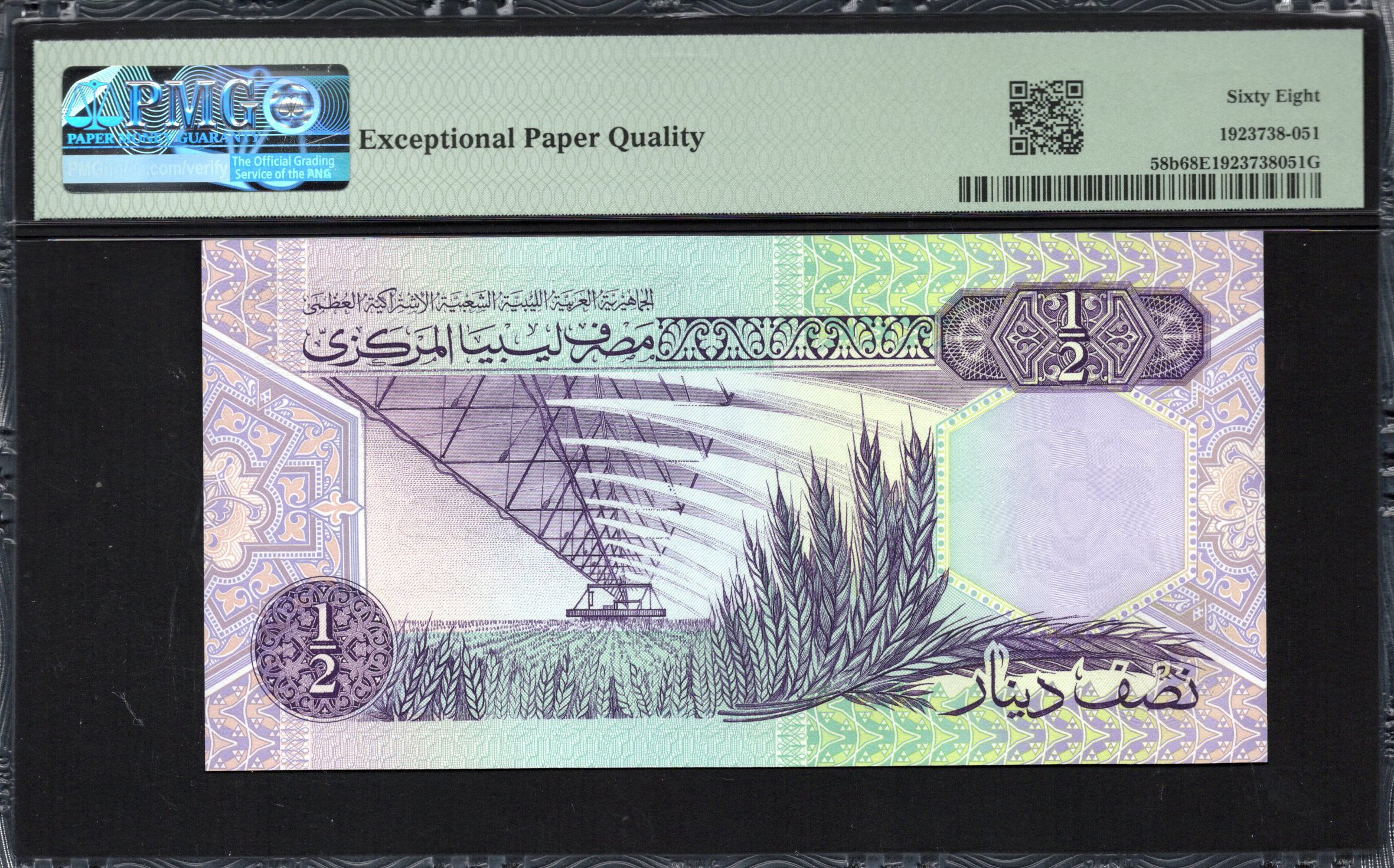 Die Vorderseite der 1/2 Dinar Banknote weist ein auffälliges Design mit geometrischen Mustern in Blau-, Grün- und Lilatönen auf. Ein wichtiges architektonisches Element, wahrscheinlich repräsentativ für das libysche Erbe, ist hervorgehoben. Die Nennwert ist deutlich erkennbar und enthält die Zahl '1/2' sowie arabische Schrift. Sicherheitsmerkmale wie ein Wasserzeichen könnten vorhanden sein, wobei die Details im Bild aufgrund der visuellen Qualität begrenzt sind.