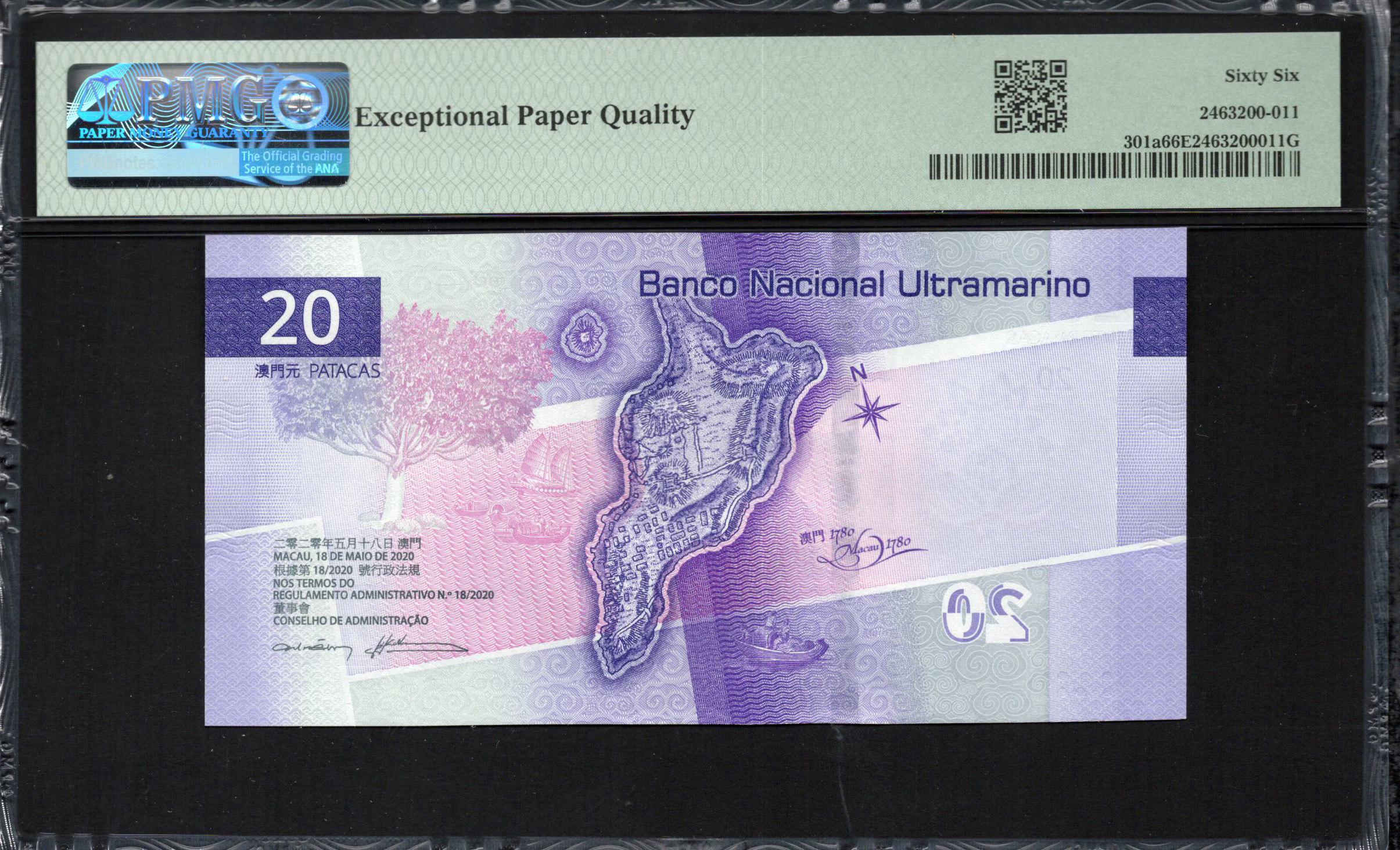 Die Vorderseite der 20 Patacas Banknote zeigt prominent den Nennwert und die Aufschrift 'Vinte Patacas' sowohl auf Portugiesisch als auch auf Chinesisch. Die Farbpalette umfasst Schattierungen von Lila, ergänzt durch subtile Farbverläufe und aufwendige Muster, die einen komplizierten Hintergrund bilden. Zentral im Design steht die Abbildung der Bank of China, die die wirtschaftliche Bedeutung dieser Institution repräsentiert. Das Wasserzeichen der Lotusblüte ist sichtbar und bietet sowohl Schönheit als auch ein Sicherheitsmerkmal gegen Fälschungen. Außerdem sind verschiedene Mikroschriften zu sehen, die die Fälschungssicherheit weiter erhöhen.