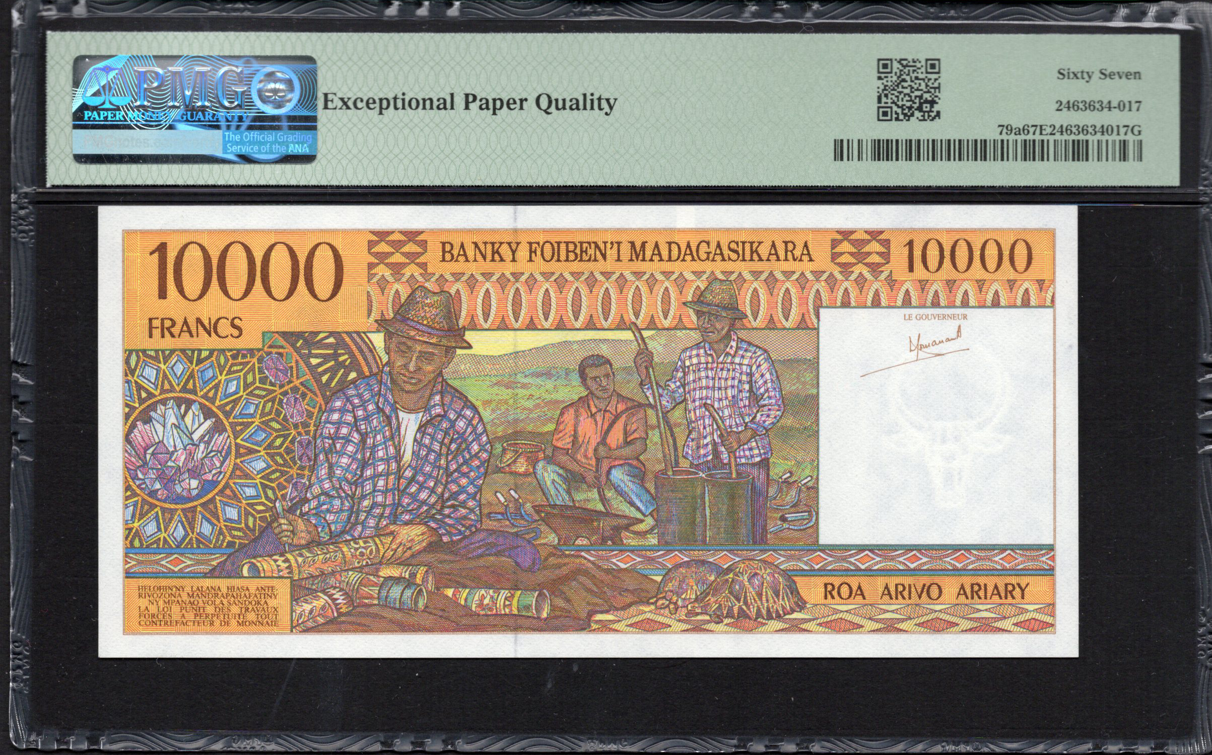 Die Vorderseite der Banknote zeigt ein detailliertes Porträt eines madagassischen Mannes, der den Geist des Volkes verkörpert. Um ihn herum befinden sich traditionelle Musikinstrumente, die die Bedeutung der Musik in der madagassischen Kultur unterstreichen. Geometrische Muster in Erdtönen, zusammen mit dem deutlich sichtbaren Nennwert '10.000', erhöhen die visuelle Attraktivität. Sicherheitsmerkmale wie ein Wasserzeichen und Mikrotext sind subtil integriert, um sowohl Authentizität als auch ästhetischen Wert zu gewährleisten.
