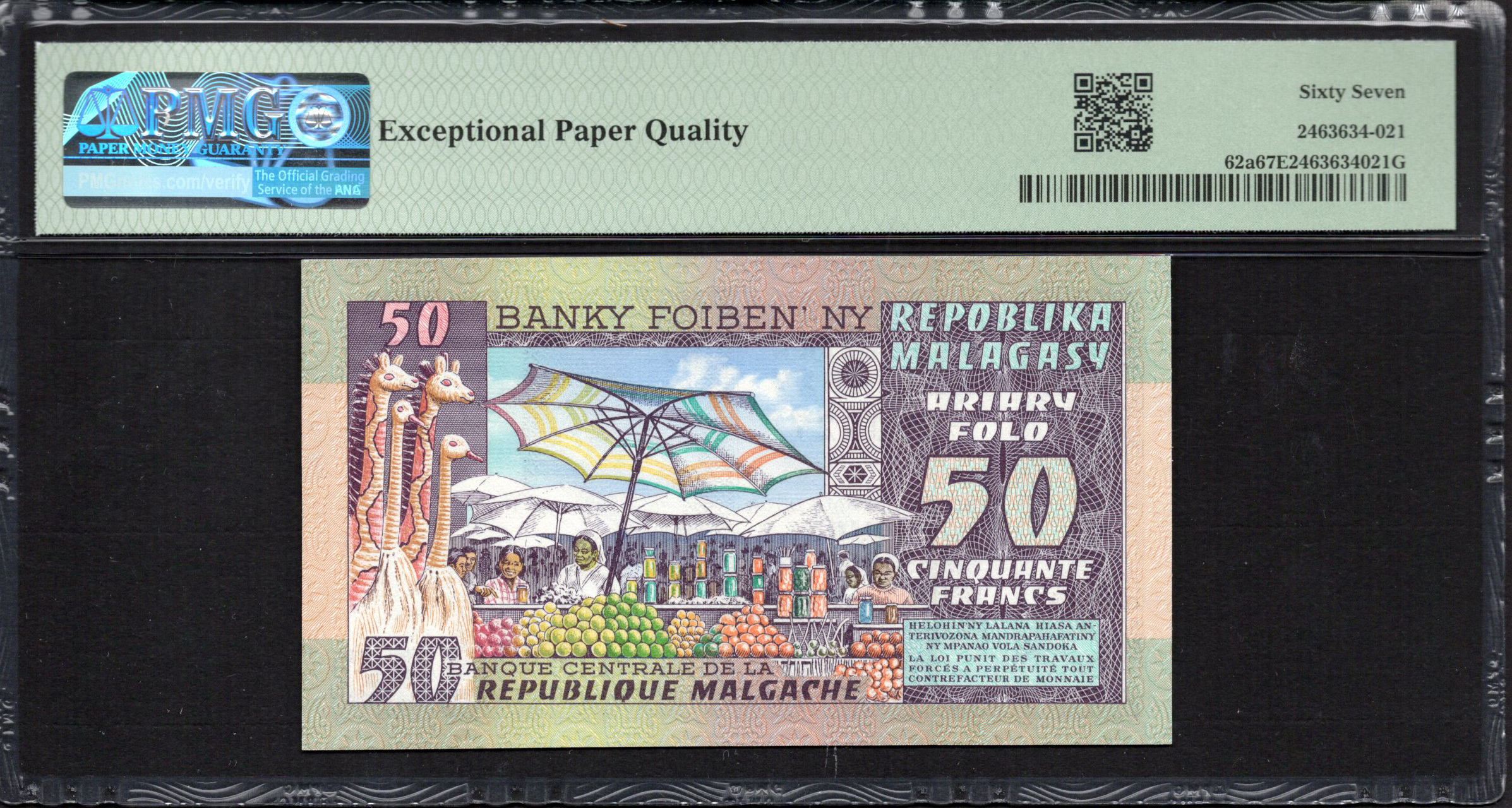 Die Rückseite dieser Banknote setzt das Thema kunstvoller Gestaltung mit floralen Mustern und geometrischen Designs fort, die das kulturelle Erbe Madagaskars widerspiegeln. Eine kontrastierende Farbpalette wird verwendet, um die visuelle Anziehungskraft zu erhöhen, was die Banknote nicht nur funktional, sondern auch zu einem Sammlerstück macht. Die denomination wird erneut hervorgehoben, zusammen mit dem Namen der Zentralbank, was deren offiziellen Status verstärkt. Sicherheitsmerkmale sind auch im Design integriert, möglicherweise mit einem holographischen Streifen oder anderen Elementen zur Fälschungsprävention, die sowohl funktional als auch visuell ansprechend sind und Tiefe und Sicherheit der Note hinzufügen.
