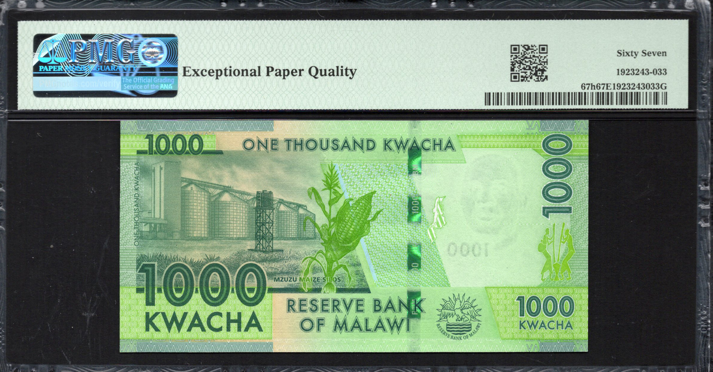 Auf der Rückseite zeigt die Banknote eine Darstellung einer Tierwelt-Szene, die symbolische Darstellungen der malawischen Fauna beinhaltet. Das Gesamtkonzept bleibt in den auffälligen Grüntönen und es gibt eine klare Anzeige der Denomination '1000 KWACHA'. Bemerkenswerte Sicherheitsmerkmale wie ein holografisches Band sind sichtbar und bieten zusätzlichen Schutz gegen Fälschung. Der Hintergrund enthält abstrakte Muster, die die ästhetische Anziehungskraft erhöhen und die kulturelle Bedeutung der Banknote unterstützen.