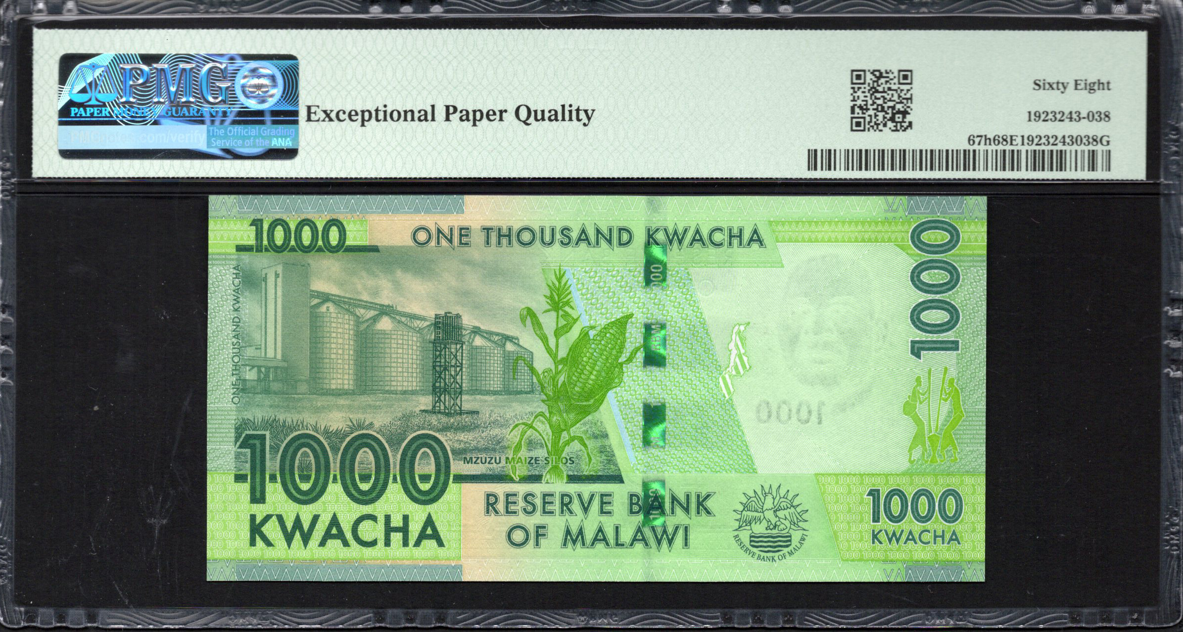 Die Rückseite des Scheins setzt das Thema von lebendigen Farben und komplexen Designs fort. Sie zeigt ein Bild, das repräsentativ für die Kultur und die wirtschaftlichen Aktivitäten Malawis ist, mit verschiedenen landwirtschaftlichen Motiven und dem Schriftzug 'ISSUED UNDER THE AUTHORITY OF THE RESERVE BANK OF MALAWI.' Die prominente Darstellung der Nennwertangabe und das Wasserzeichen-Design fügen Sicherheitsebenen hinzu. Diese Seite enthält außerdem verschiedene Farbverläufe und Muster, die nicht nur ästhetisch sind, sondern auch funktional zur Verhinderung von Fälschungen dienen.