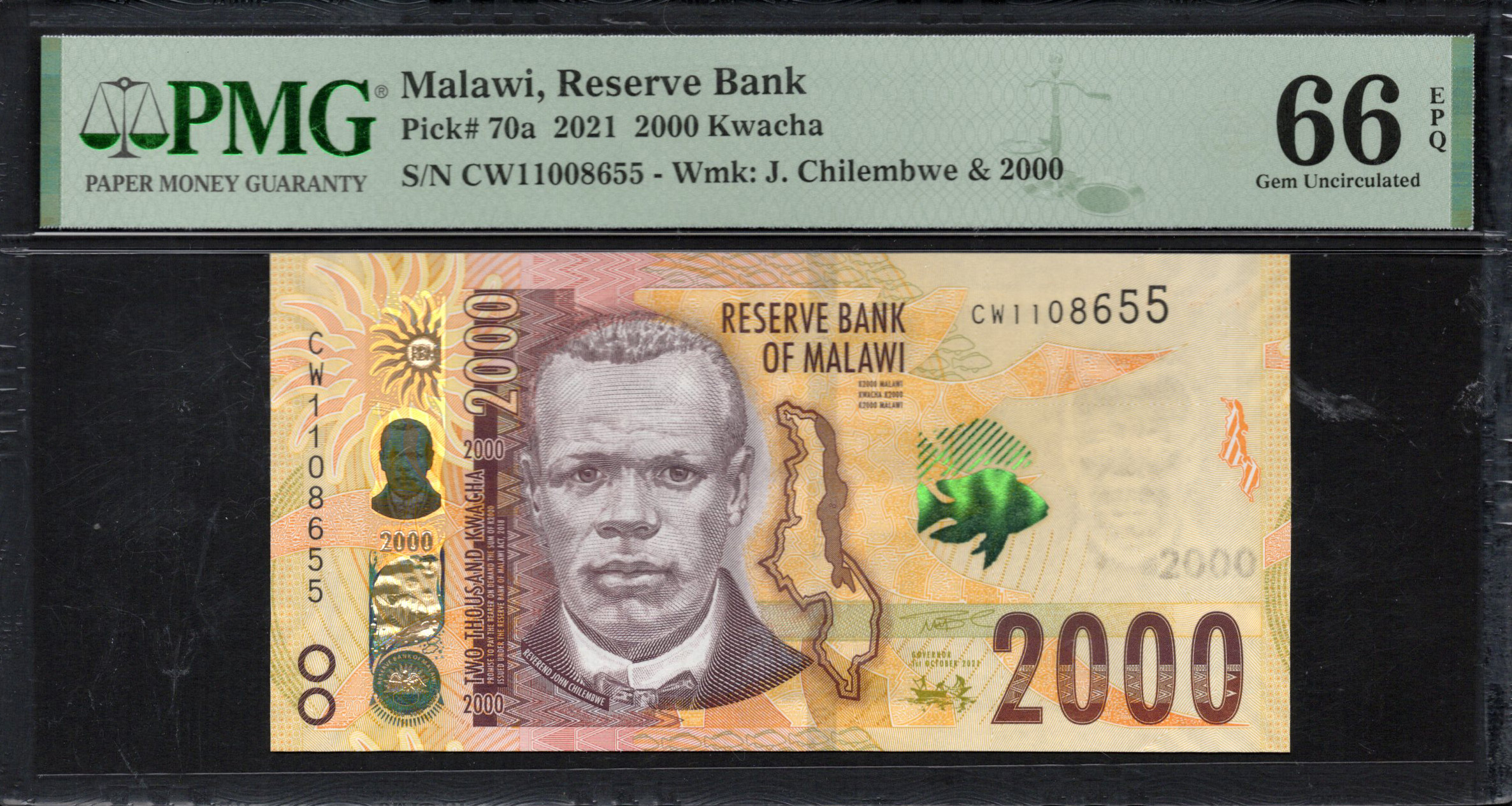 Der 2000 Kwacha-Schein aus Malawi, herausgegeben von der Reserve Bank, weist komplizierte Designs und eine warme Farbpalette auf. Dieses Banknoten zeigt das beeindruckende Porträt von John Chilembwe, einer wichtigen Figur in der Geschichte Malawis, die den Kampf um Unabhängigkeit symbolisiert. Der Geldschein integriert mehrere fortschrittliche Sicherheitsmerkmale, die eine Fälschung erschweren, während die künstlerischen Elemente eine Hommage an die malawische Kultur darstellen. Die Kombination lebendiger Farben und fesselnder Bilder schafft eine bemerkenswerte Darstellung des Erbes Malawis.