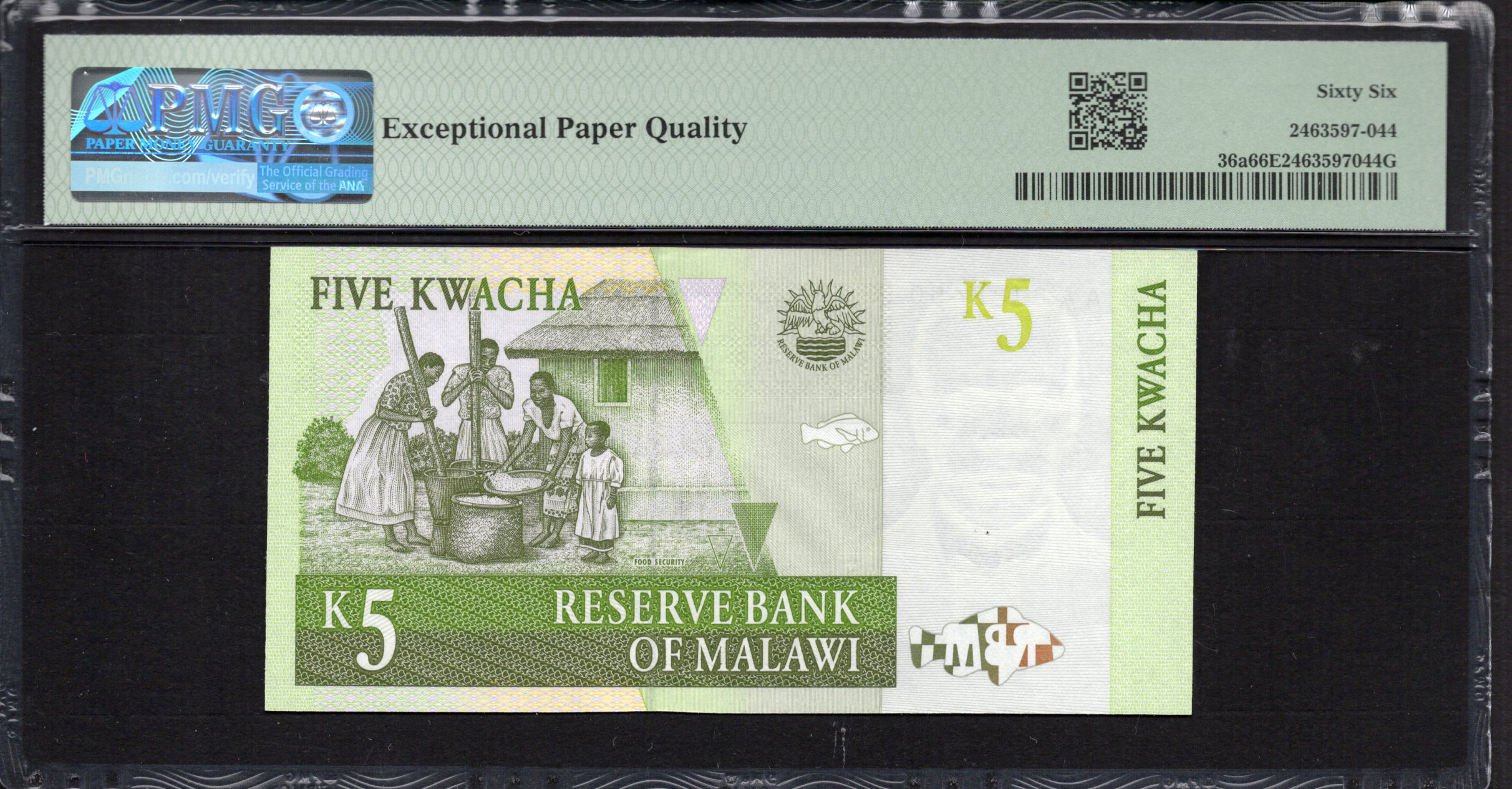 Die Rückseite der 5 Kwacha-Banknote zeigt Illustrationen, die die natürliche Schönheit und die Ressourcen Malawis symbolisieren. Sie enthält Bilder lokaler Flora und Fauna sowie Muster, die die visuelle Komplexität erhöhen. Die Farbpalette bleibt mit der Vorderseite konsistent und zeigt verschiedene Schattierungen von Grün und Creme, was ein kohärentes Design fördert. Sicherheitsmerkmale auf dieser Seite können einen Sicherheitsfaden und zusätzliche Mikroschrift umfassen. Das Gesamtbild vermittelt ein Gefühl von nationalem Stolz und Verbindung zur Landschaft, wodurch die Banknote nicht nur ein Zahlungsmittel, sondern auch eine Darstellung der malawischen Identität und Werte wird.