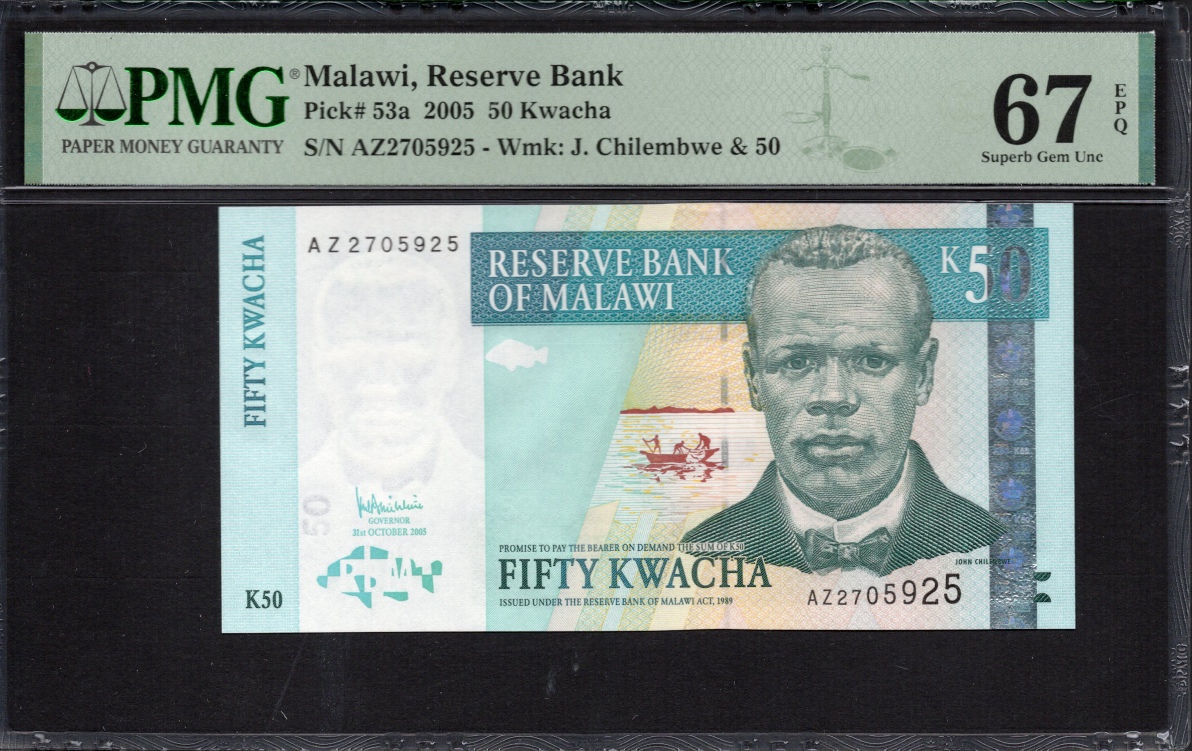 Die Rückseite der 50 Kwacha-Banknote zeigt die malerische Schönheit Malawis und enthält stilisierte Bilder traditioneller Fischerboote am See, die die Abhängigkeit des Landes von natürlichen Ressourcen symbolisieren. Der Hintergrund verbindet Blau- und Grüntöne und ruft Ruhe hervor. Außerdem enthält die Rückseite Mikroschrift und einen holografischen Streifen, der die Farbe wechselt, was fortschrittliche Sicherheit gegen Fälschungen bietet. Diese Seite ergänzt die thematischen Elemente von natürlichen Reichtümern mit künstlerischer Vielfalt und verkörpert weiter das Wesen Malawis.