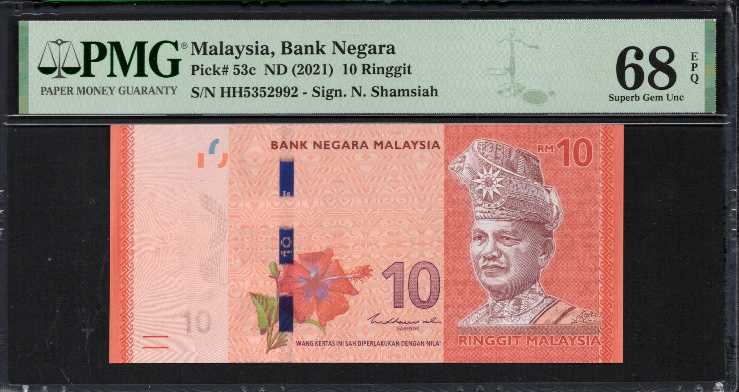 Auf der Rückseite präsentiert die Banknote eine Reihe lebendiger Farben mit einer prominenten Darstellung einer Hibiskusblüte, der Nationalblume Malaysias, zusammen mit geometrischen Mustern, die Tiefe und Textur hinzufügen. Oben in der Mitte sind große Nennwerte sichtbar, die die Erkennung erleichtern. Darüber hinaus spiegeln das transparente Fenster und die holografischen Elemente moderne technologische Fortschritte wider, die ein sicheres und visuell faszinierendes Design gewährleisten.