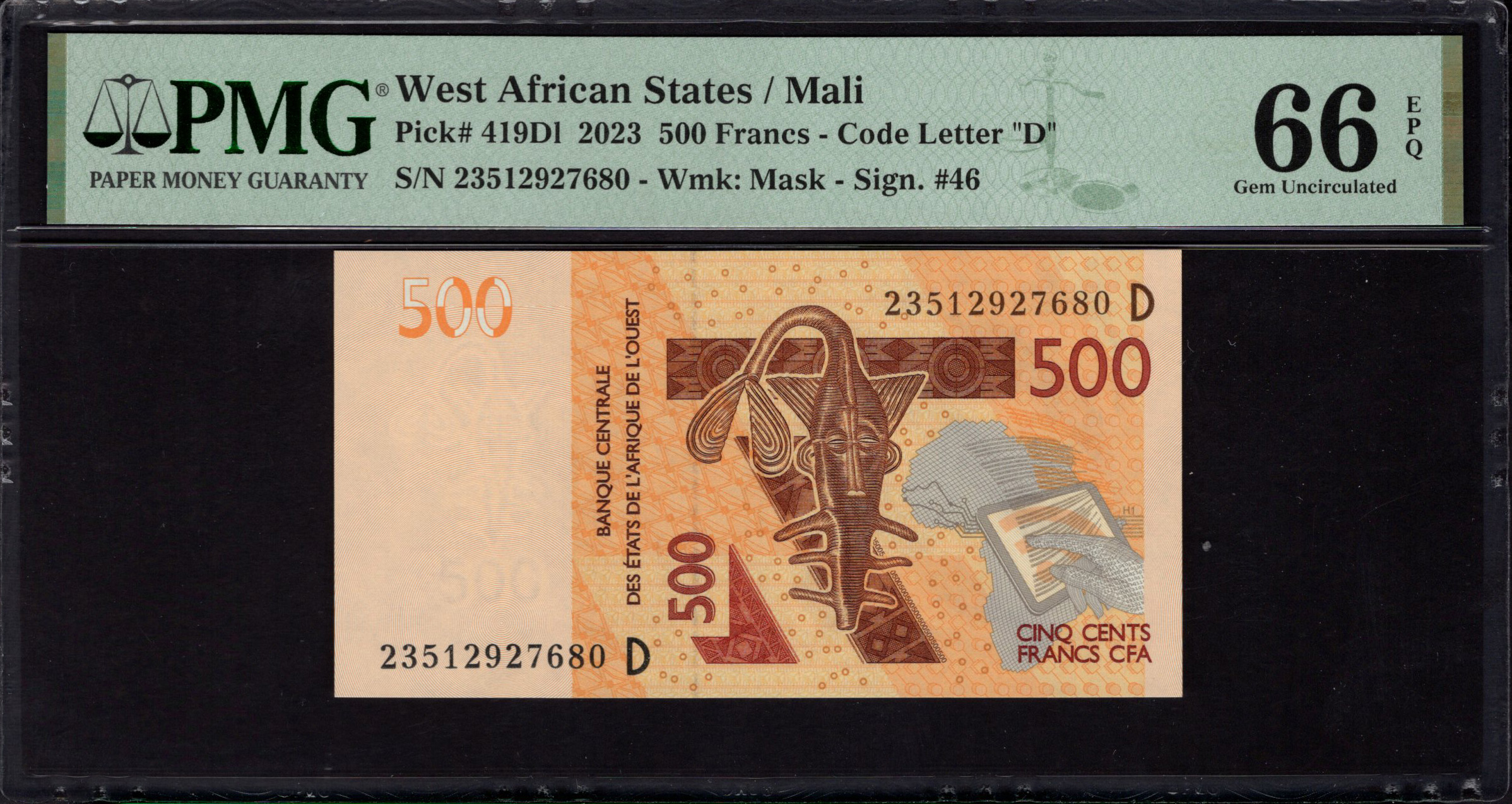 Die 500 Francs-Banknote aus Mali, ausgegeben im Jahr 2023, präsentiert lebendige Farben und komplexe Designs, die das kulturelle Erbe westafrikanischer Länder widerspiegeln. Diese Note zeigt ein markantes Stammesmaskenmotiv, das den künstlerischen Reichtum und die Traditionen der Region symbolisiert. Bemerkenswert sind die verschiedenen Sicherheitsmerkmale, die zur Fälschungsprävention beitragen und somit die Echtheit und Kunstfertigkeit der Note unterstreichen.