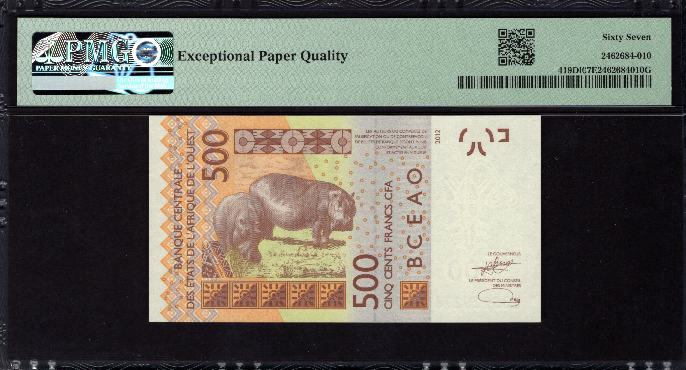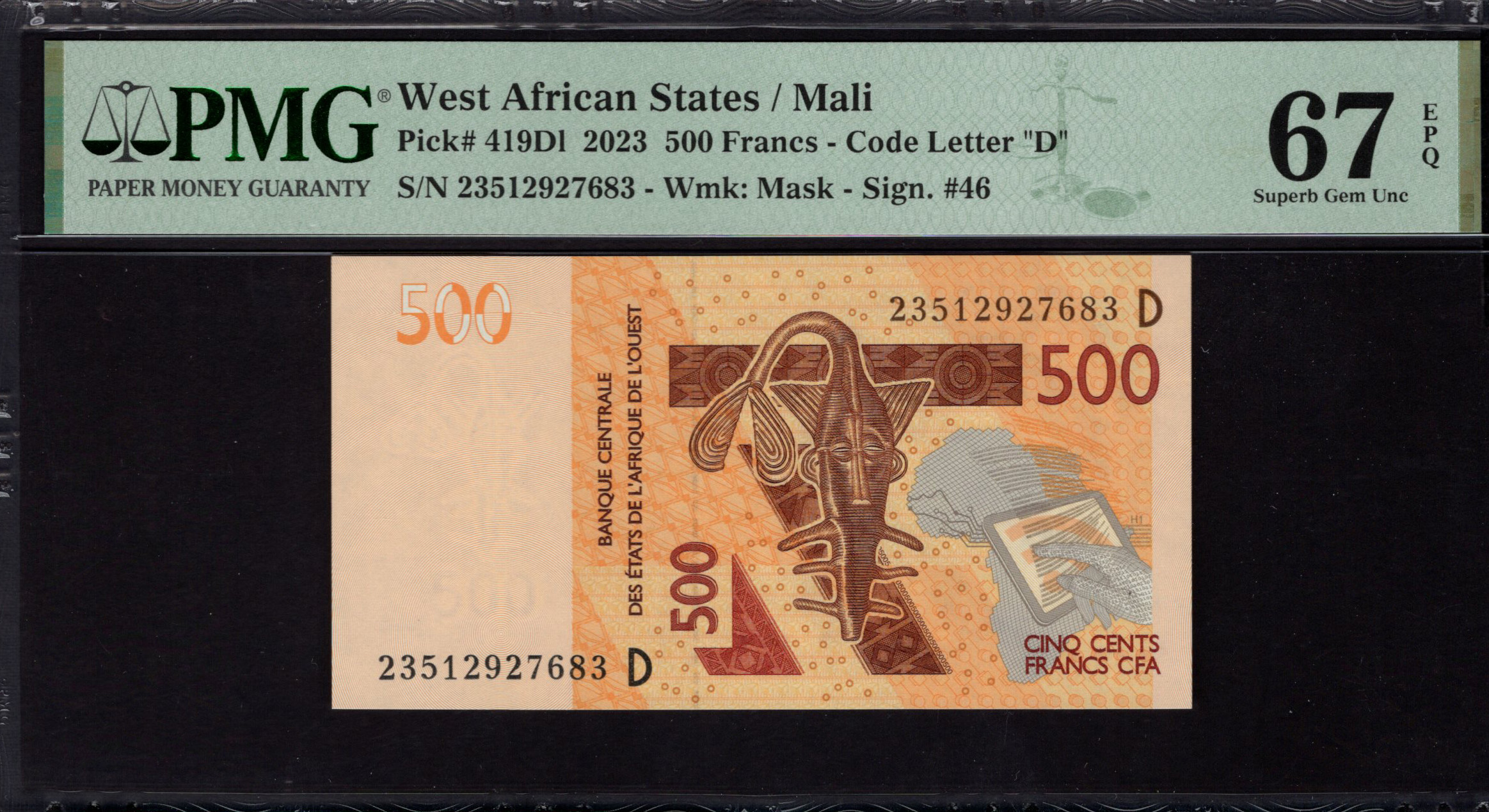 Die Vorderseite der Banknote zeigt prominent eine traditionelle Maske, ein wichtiges kulturelles Symbol, das das künstlerische Erbe Malis repräsentiert. Sie ist vor einem Hintergrund warmer Orangetöne mit geometrischen Mustern platziert, die die visuelle Anziehungskraft erhöhen. Der Nennwert '500' ist an mehreren Stellen deutlich aufgedruckt, was sofortige Erkennung gewährleistet. Merkmale wie der Text 'BANQUE CENTRALE DES ÉTATS DE L'AFRIQUE DE L'OUEST' unterstreichen ihre Herkunft, während die Seriennummer ein Maß an Sicherheit und Einzigartigkeit hinzufügt. Das Gesamtdesign balanciert Kunstfertigkeit mit Funktionalität und macht es sowohl visuell eindrucksvoll als auch praktisch.