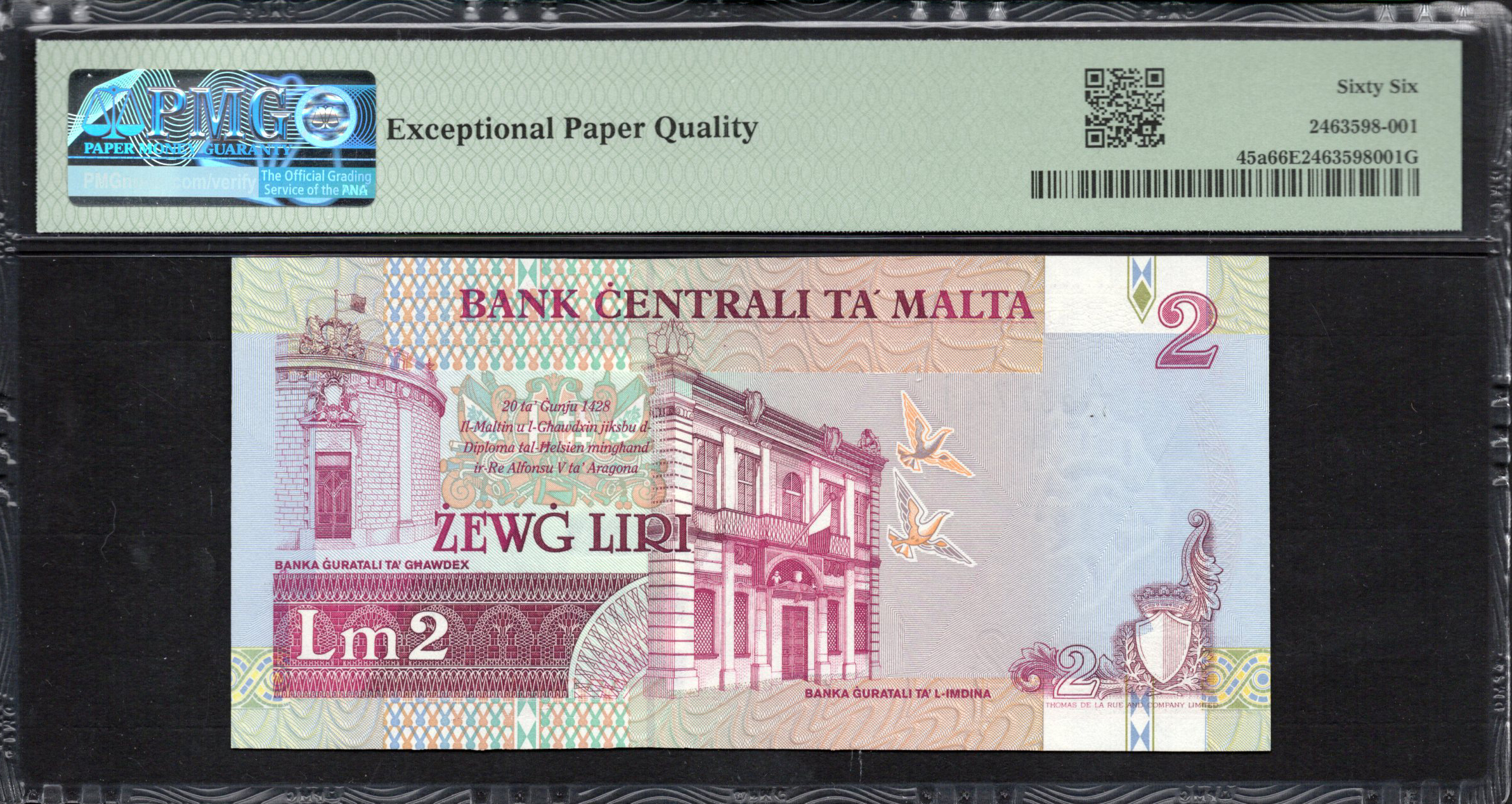 Die Rückseite der Banknote umfasst traditionelle maltesische Elemente und zeigt Symbole, die das maritime Erbe der Insel repräsentieren. Der Hintergrund zeigt eine Mischung aus warmen Farben, die die künstlerischen Motive hervorheben. Es gibt einen aufwändigen Rand, der das zentrale Design weiter einrahmt. Sicherheitsmerkmale wie UV-Druck und ein kompliziertes Muster von Linien sind ebenfalls in das Rückseitendesign integriert, um Fälschungen zu verhindern. Die Note endet mit dem prominenten Text 'Bank Centrali ta' Malta', zusammen mit der Denomination in Maltesisch und Englisch.