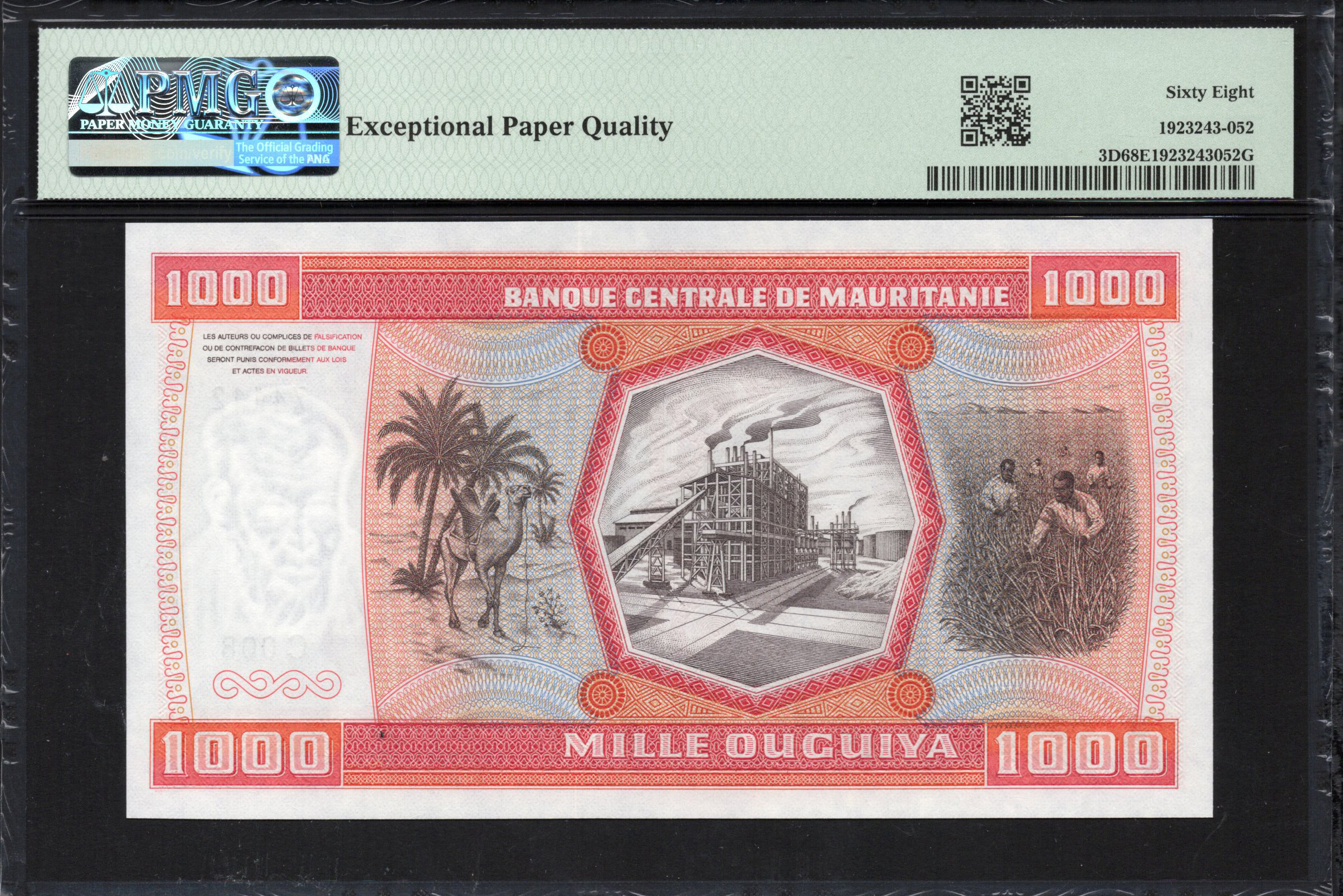 Auf der Rückseite steht das kunstvolle Design im Mittelpunkt, mit wirbelnden Mustern in Blau und Rot, die ein Gefühl von Bewegung und Tiefe erzeugen. Der Hintergrund enthält zusätzliche Sicherheitsmerkmale sowie ein Wasserzeichen, das die Integrität des Scheins unterstreicht. Das Design spiegelt eine Mischung aus moderner Kunst und traditionellen islamischen Einflüssen wider, gekennzeichnet durch symmetrische Muster. Diese Seite verstärkt die Bedeutung des Scheins, indem sie die Kultur und Geschichte Mauretaniens mit den modernen Nutzungsmöglichkeiten von Währungen verbindet.
