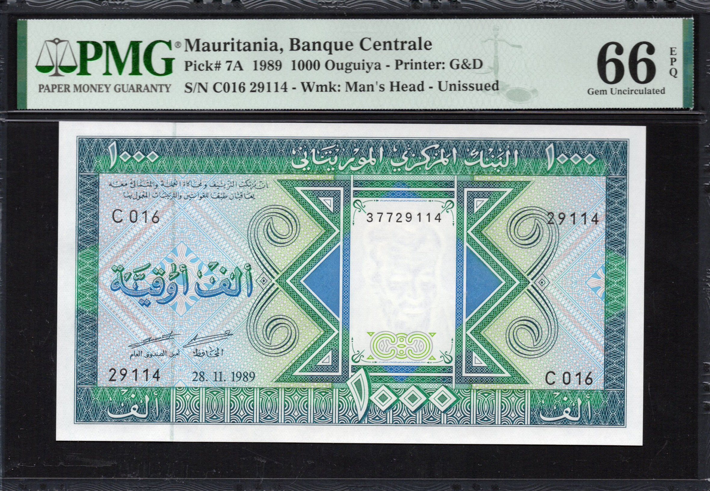 Der 1000 Ouguiya-Schein aus Mauretanien, der 1989 ausgegeben wurde, zeigt komplizierte Designs, die das kulturelle Erbe des Landes widerspiegeln. Der Schein weist reiche Farben und Muster auf, die hauptsächlich aus Blau-, Grün- und Weißtönen bestehen und eine einzigartige Ästhetik schaffen. Die Vorderseite zeigt ein markantes Motiv eines Männerkopfes, umgeben von kunstvollen Rändern und stilisierter arabischer Schrift. Dieser Schein ist nicht nur aufgrund seiner Nennwerts von Bedeutung, sondern auch als Kunstwerk, das die nationale Identität verkörpert. Darüber hinaus gewährleisten die Sicherheitsmerkmale auf dem Schein seine Authentizität, was ihn zu einem bedeutenden Sammlerstück für Numismatiker macht.