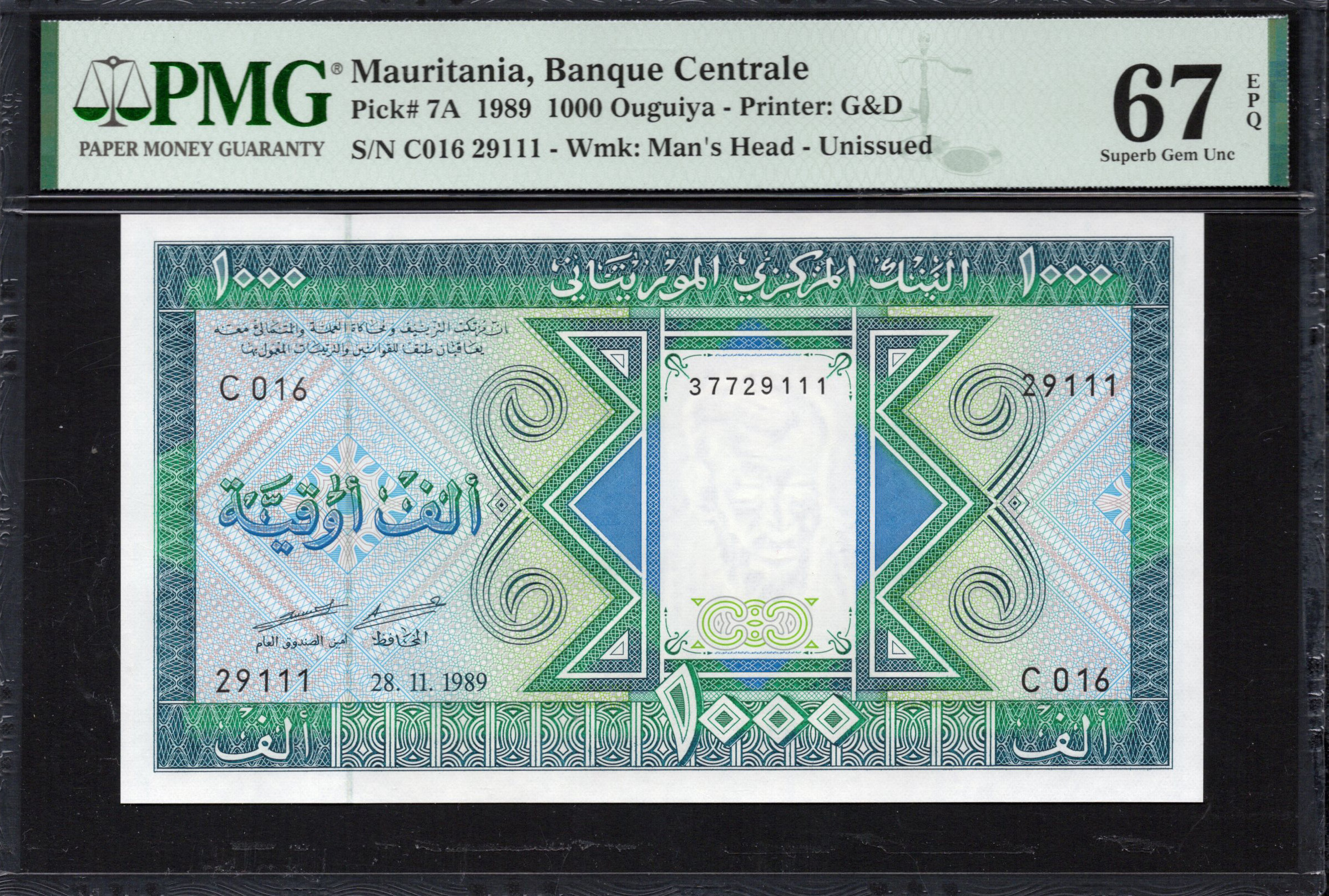 Die Rückseite des Scheins setzt das ornamentale Design der Vorderseite fort und umfasst wahrscheinlich ähnliche grüne und blaue Farben. Es ist plausibel, dass sie zusätzliche textliche Informationen oder symbolische Bilder enthält, die das Erbe Mauritaniens widerspiegeln. Die Muster sollten mit der Vorderseite kohärent sein, was den gesamten ästhetischen Stil verstärkt. Als ein Stück nicht ausgegebener Währung behält dieser Schein ein Element der Einzigartigkeit, das von Sammlern oft gesucht wird. Während spezifische Details nicht vollständig sichtbar sind, spielen alle eingebetteten Sicherheitsmerkmale eine entscheidende Rolle für die Wahrung der Authentizität.