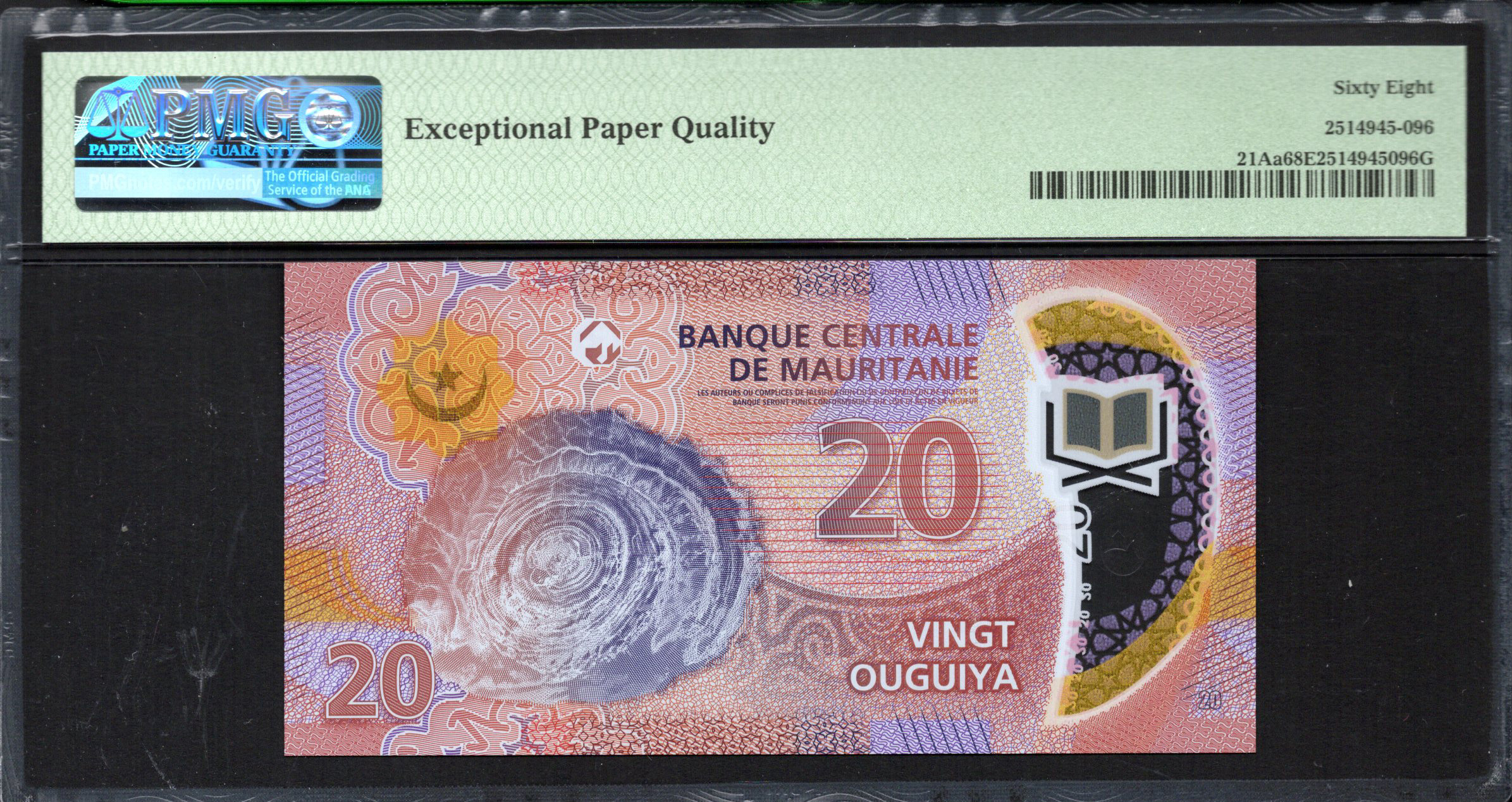 Die Vorderseite des Banknotens zeigt deutlich die Stückelung '20' in großer Schrift, begleitet von dekorativen Mustern in Rosa- und Lilatönen. Ein stilisiertes offenes Buch wird dargestellt, das Bildung und Wissen symbolisiert, vor dem Hintergrund, der traditionelle mauretanische Designelemente integriert. Der Text auf dieser Seite ist in Arabisch, was das kulturelle Erbe der Region betont. Das Wasserzeichen, das sichtbar wird, wenn es gegen das Licht gehalten wird, verleiht eine zusätzliche Sicherheitsebene und unterstreicht das raffinierte Design der Banknote.