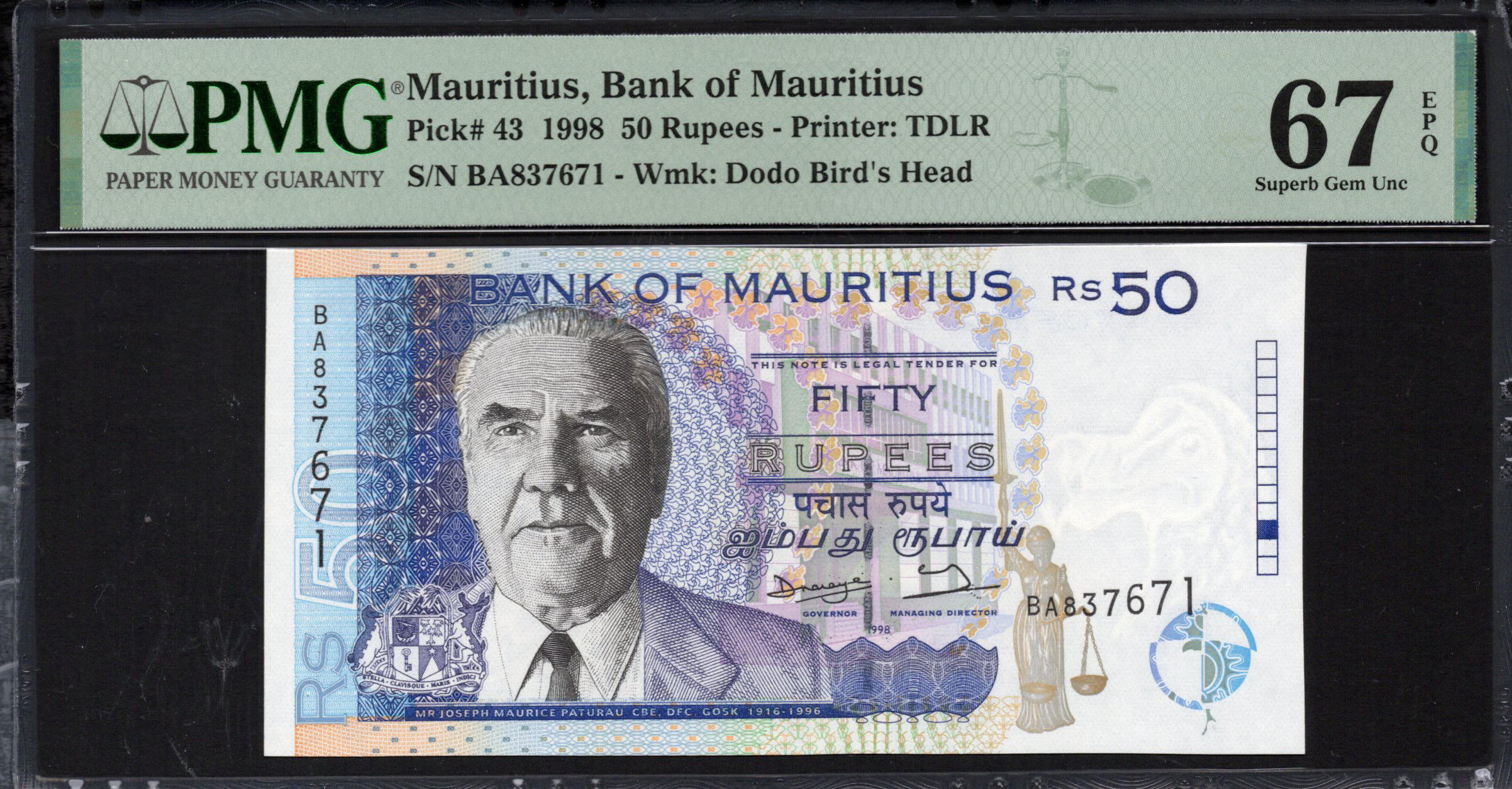 Die Vorderseite des 50 Rupee-Scheins zeigt ein Portrait einer bedeutenden historischen Figur und strahlt Autorität und Erbe aus. Der Schein präsentiert komplexe Muster und Farbverläufe, hauptsächlich in Blau- und Lilatönen, die einen visuell reizvollen Hintergrund schaffen. Auffällige Sicherheitsmerkmale sind ein Wasserzeichen und Mikroschrift, die die Echtheit erhöhen. Der Text 'BANK OF MAURITIUS' wird klar angezeigt, zusammen mit dem Nennwert '50' in Englisch und lokalen Schriftsystemen. Die Designelemente schaffen eine künstlerische und sichere Darstellung der mauritischen Währung.
