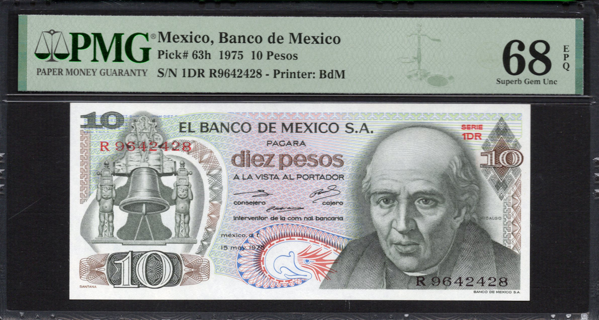 Die Vorderseite der 10 Pesos Banknote zeichnet sich durch das auffällige Bild einer Glocke aus, flankiert von zwei historischen Figuren, die wichtige Momente in der mexikanischen Geschichte repräsentieren. Der Hintergrund enthält komplexe Muster und Rot-Grün-Farbtöne, die ein lebendiges und ansprechendes visuelles Erlebnis bieten. Der Nennwert '10' wird prominent dargestellt, ebenso wie die Worte 'El Banco de Mexico S.A.' und 'PAGARA diez pesos A LA VISTA AL PORTADOR', die den Wert bestätigen. Zudem können Sicherheitsmerkmale wie Mikroschrift und Farbwechsel-Tinten vorhanden sein, um Fälschungen zu verhindern.
