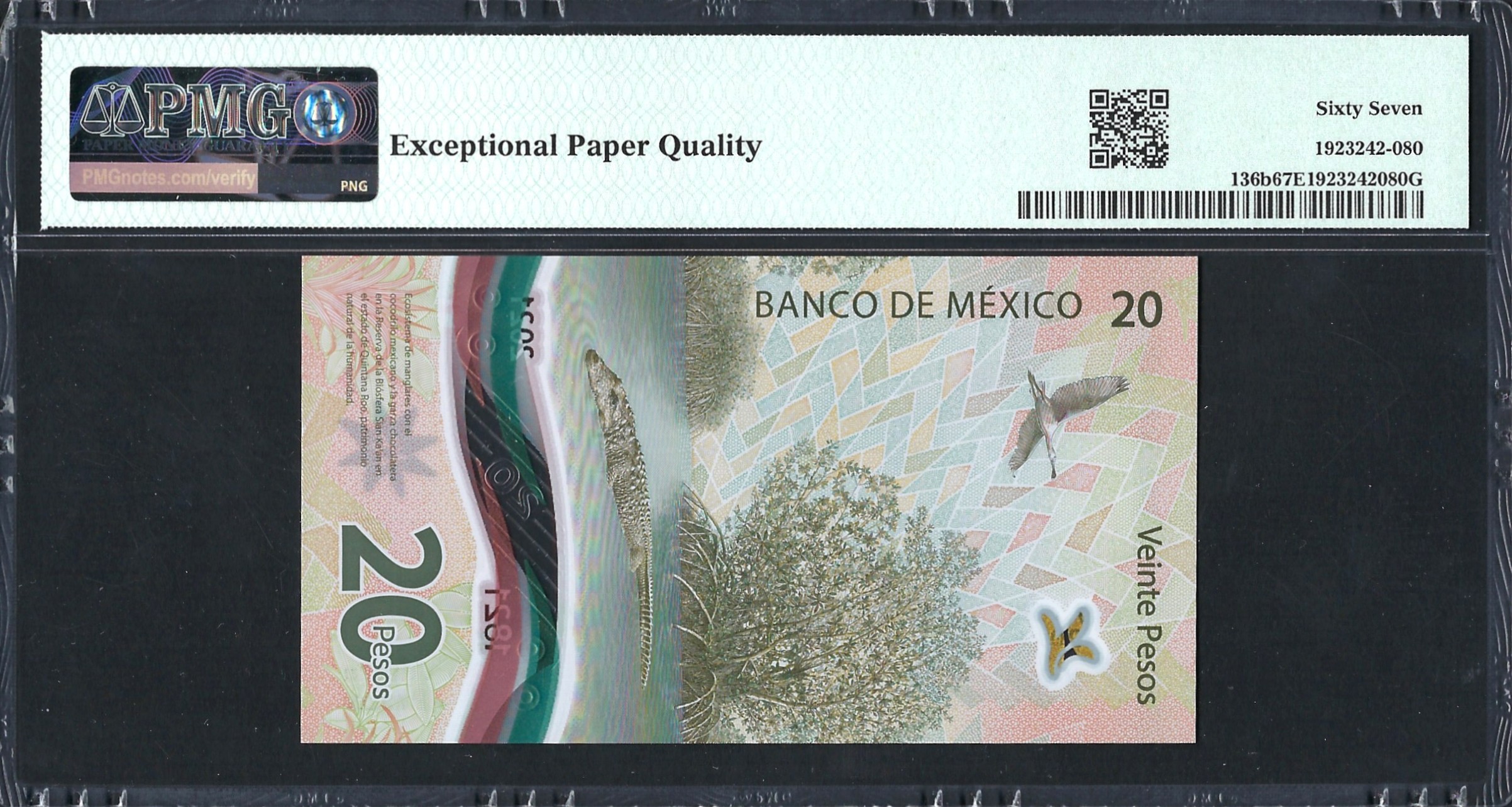 Auf der Rückseite setzt sich das Design fort mit dem Datum '1821', das die Unabhängigkeit Mexikos markiert. Der Hintergrund ist mit zarten geometrischen Formen und Texturen gefüllt, neben der Fortsetzung des lebhaften Farbschemas. Die Nennwertangabe '20 Pesos' ist prominent zu sehen, wodurch die Klarheit des Wertes gewährleistet ist. Zusätzliche Sicherheitsmerkmale wie ein holografisches Band und Muster, die sich bei bestimmtem Licht färben, erhöhen die Integrität der Note. Diese Seite fängt das Wesentliche der historischen Erzählung und des künstlerischen Erbes Mexikos ein.