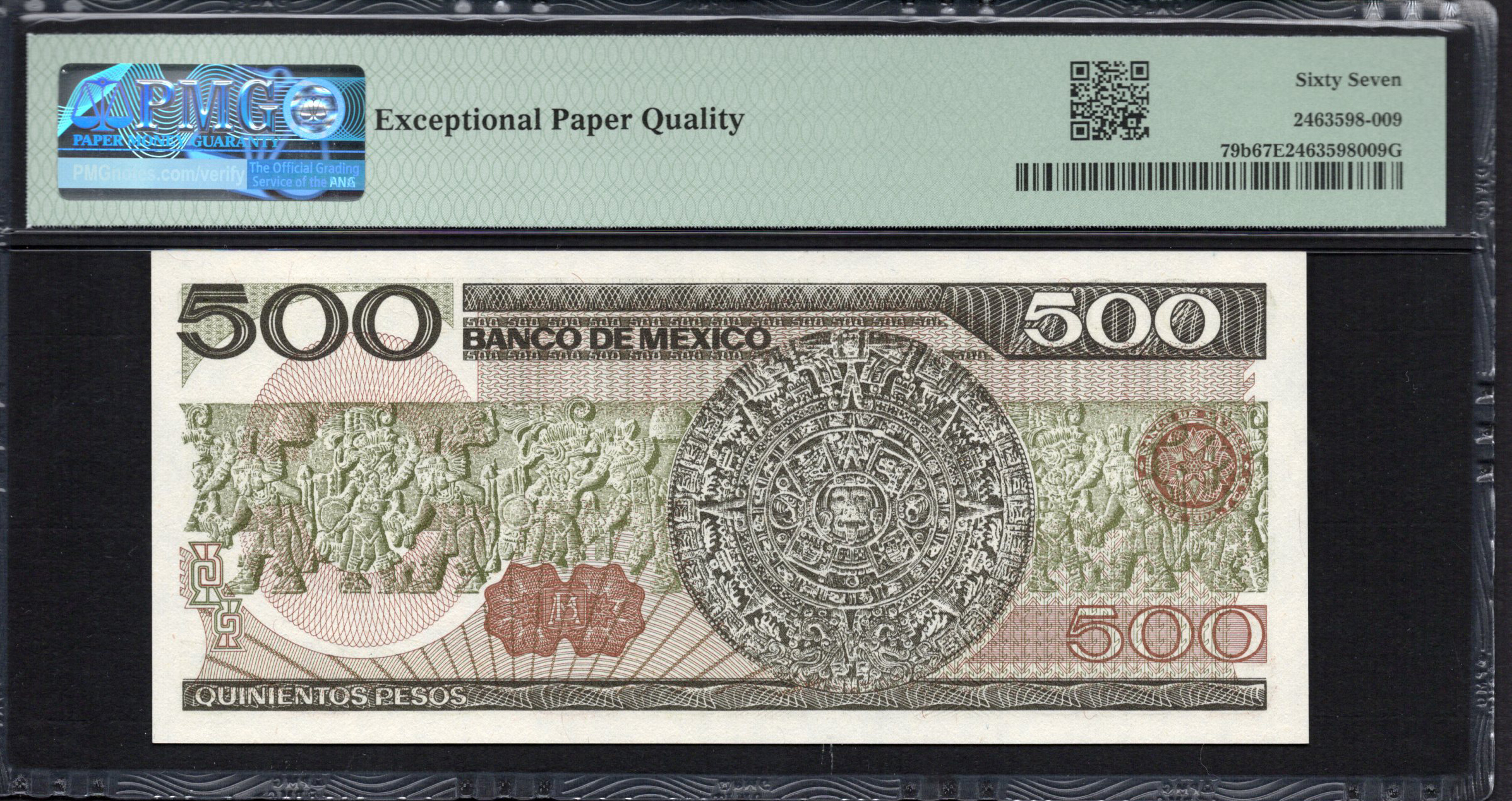 Die Rückseite der Banknote setzt das lebendige Design mit der großen Denomination „500“ fort, die prominent zu sehen ist. Eine Darstellung des mexikanischen Wappens ist abgebildet, umgeben von stilisierten Blumenelementen, die der visuellen Komposition Tiefe verleihen. Weitere Details beinhalten die Phrase „PAGARA A LA VISTA AL PORTADOR“ – eine Erklärung zur gesetzlichen Zahlungsmittel. Sicherheitsmerkmale wie ein transparenter Bereich und komplexer Halbtontuckdruck sind vorhanden, was die gesamte Ästhetik der Banknote verbessert und deren Authentizität sowie Sicherheit vor Fälschungen gewährleistet.