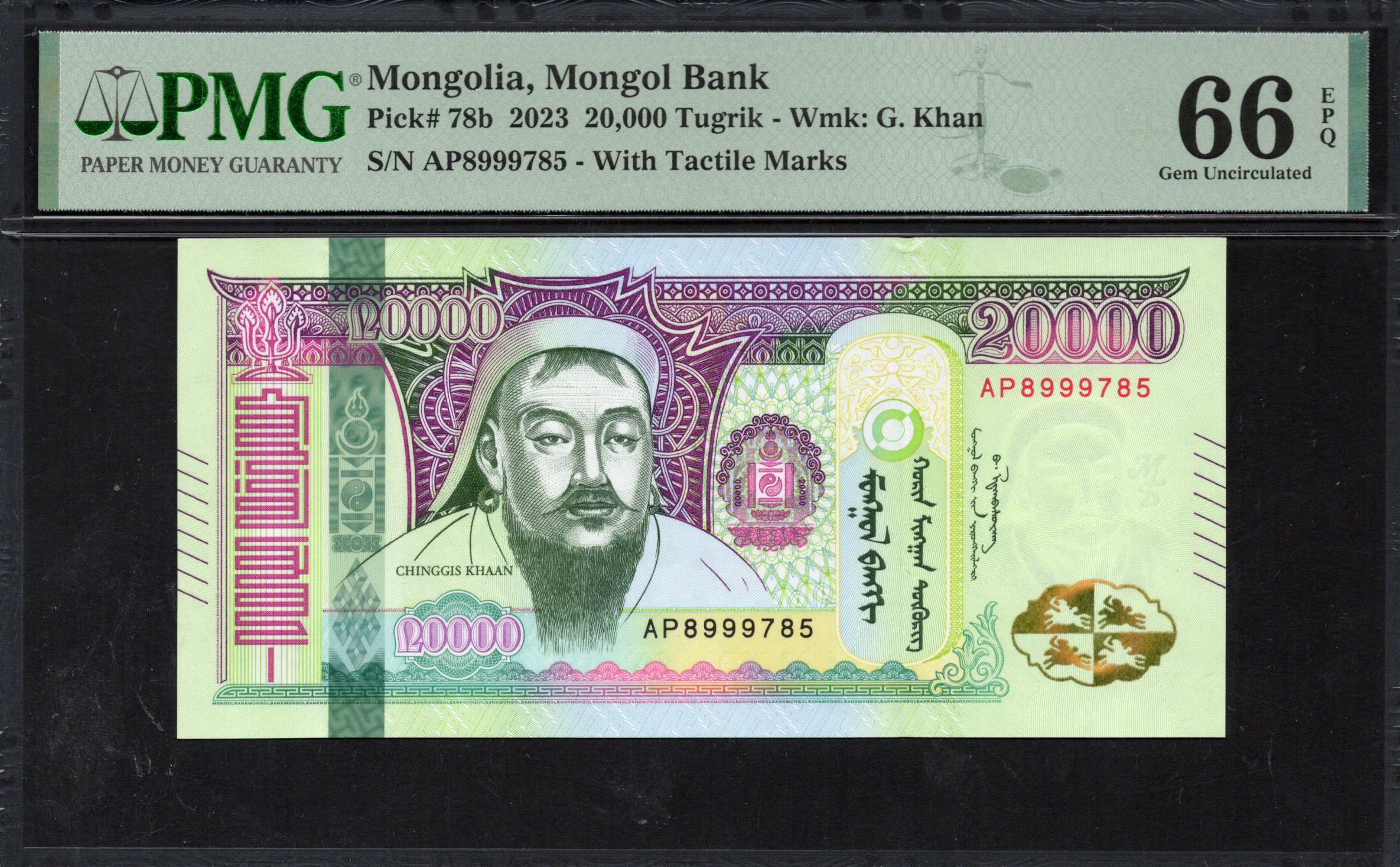 Die 20.000 Tugrik Banknote aus der Mongolei zeigt die historische Figur Dschingis Khan und spiegelt das reiche kulturelle Erbe des Landes wider.
