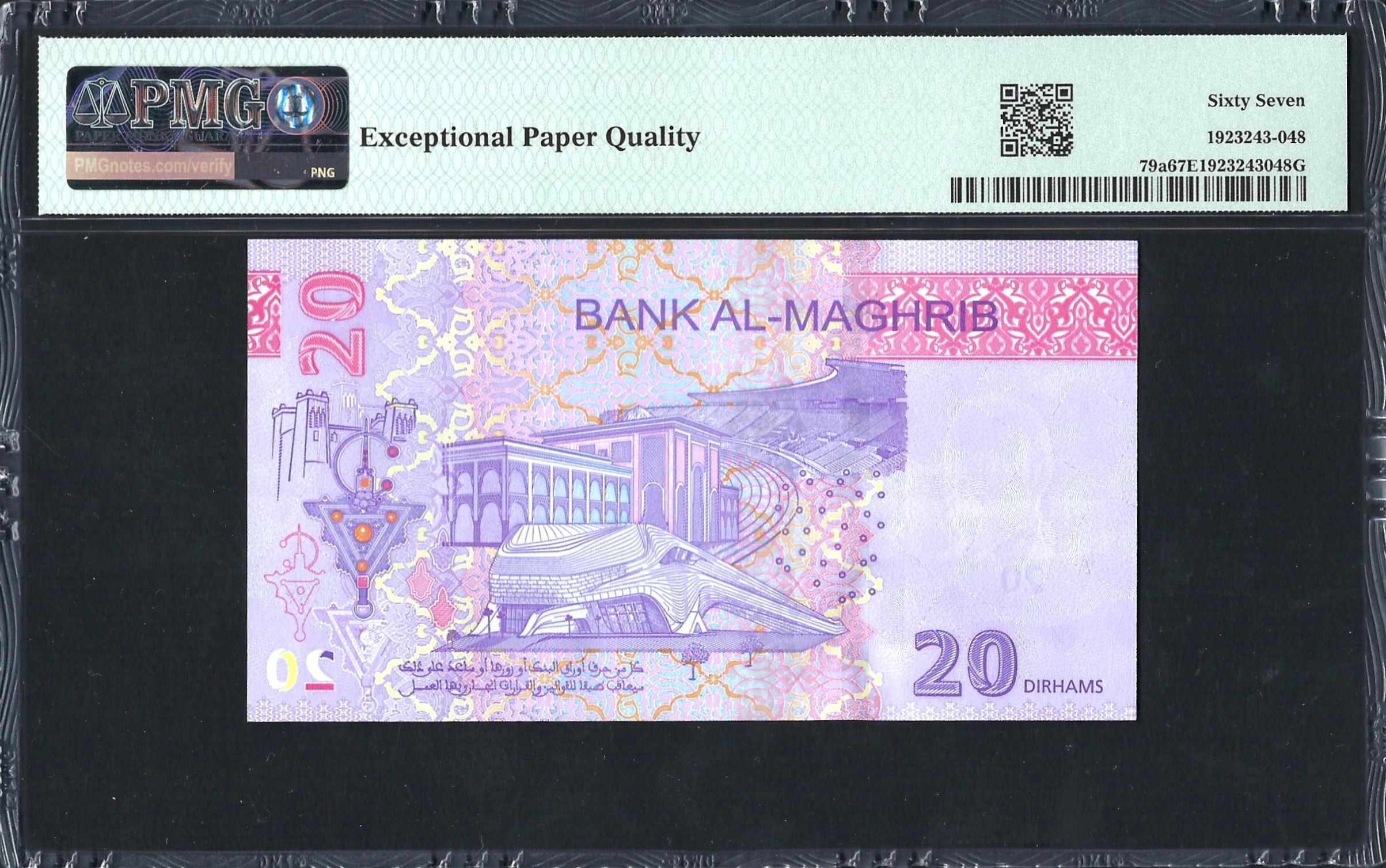 Die Rückseite des Scheins behält das Thema der kulturellen Repräsentation bei und zeigt bedeutende architektonische Elemente, die das Erbe Marokkos symbolisieren. Der Einsatz lebendiger Farben und detaillierter Muster steigert den visuellen Reichtum des Scheins. Die Nennwertangabe '20' ist klar sichtbar und von zusätzlichen dekorativen Merkmalen umgeben. Darüber hinaus behält diese Seite das gleiche Sicherheitsniveau wie die Vorderseite bei, mit Elementen wie holografischen Bildern und anderen Methoden zur Verhinderung von Fälschungen. Das Design spiegelt Marokkos Engagement wider, die kulturelle Identität zu bewahren und gleichzeitig sichere Währung zu gewährleisten.