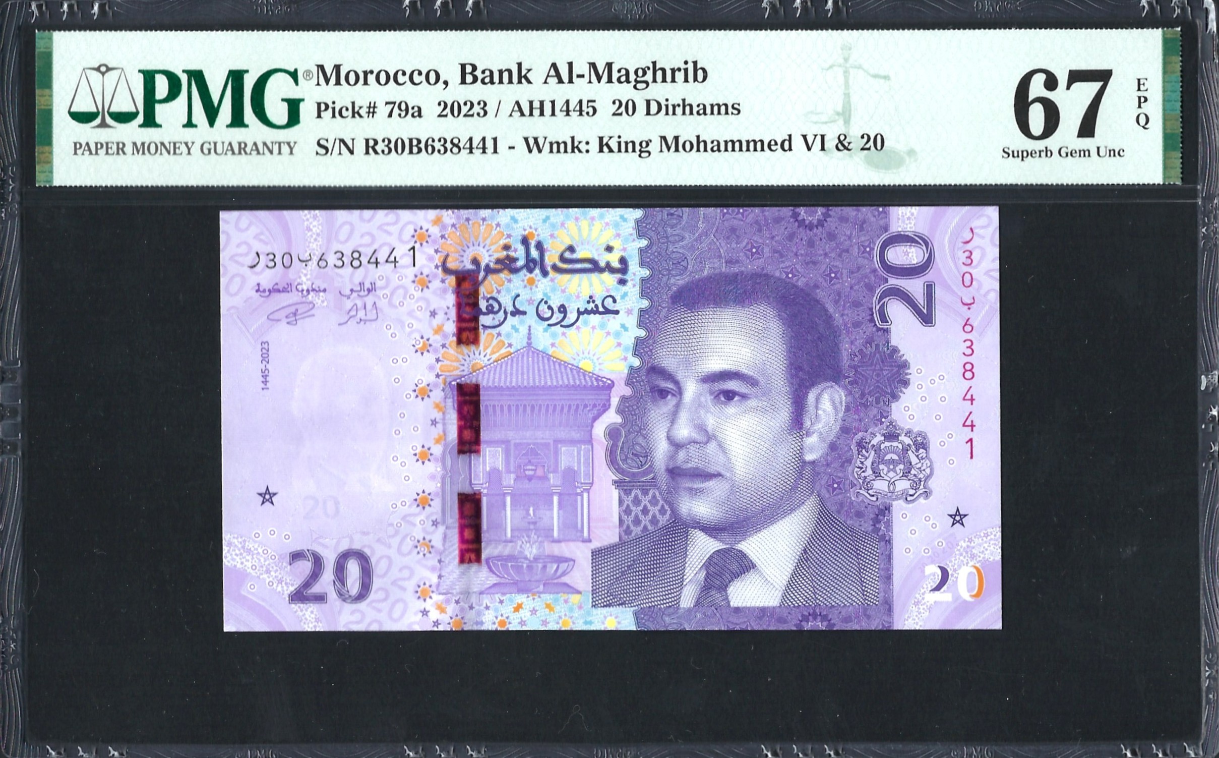 Der 20 Dirham-Schein aus Marokko, herausgegeben von der Bank Al-Maghrib, präsentiert komplexe Designs und reiche Farben, die charakteristisch für marokkanische Währungen sind. Auf diesem Schein befindet sich ein Porträt von König Mohammed VI., das die Monarchie und das reiche Erbe des Landes widerspiegelt. Der Hintergrund ist mit dekorativen Mustern verziert, die die visuelle Anziehungskraft des Scheins erhöhen, ergänzt durch Sicherheitsmerkmale zur Gewährleistung der Authentizität. In auffälligem Lila gehalten, zeigt der Schein auch arabische Schriftzüge und emblematische Symbole, die Marokko repräsentieren. Die Druckqualität und Handwerkskunst betonen die Bedeutung des Designs von Geldscheinen in Bezug auf Sicherheit und Ästhetik.
