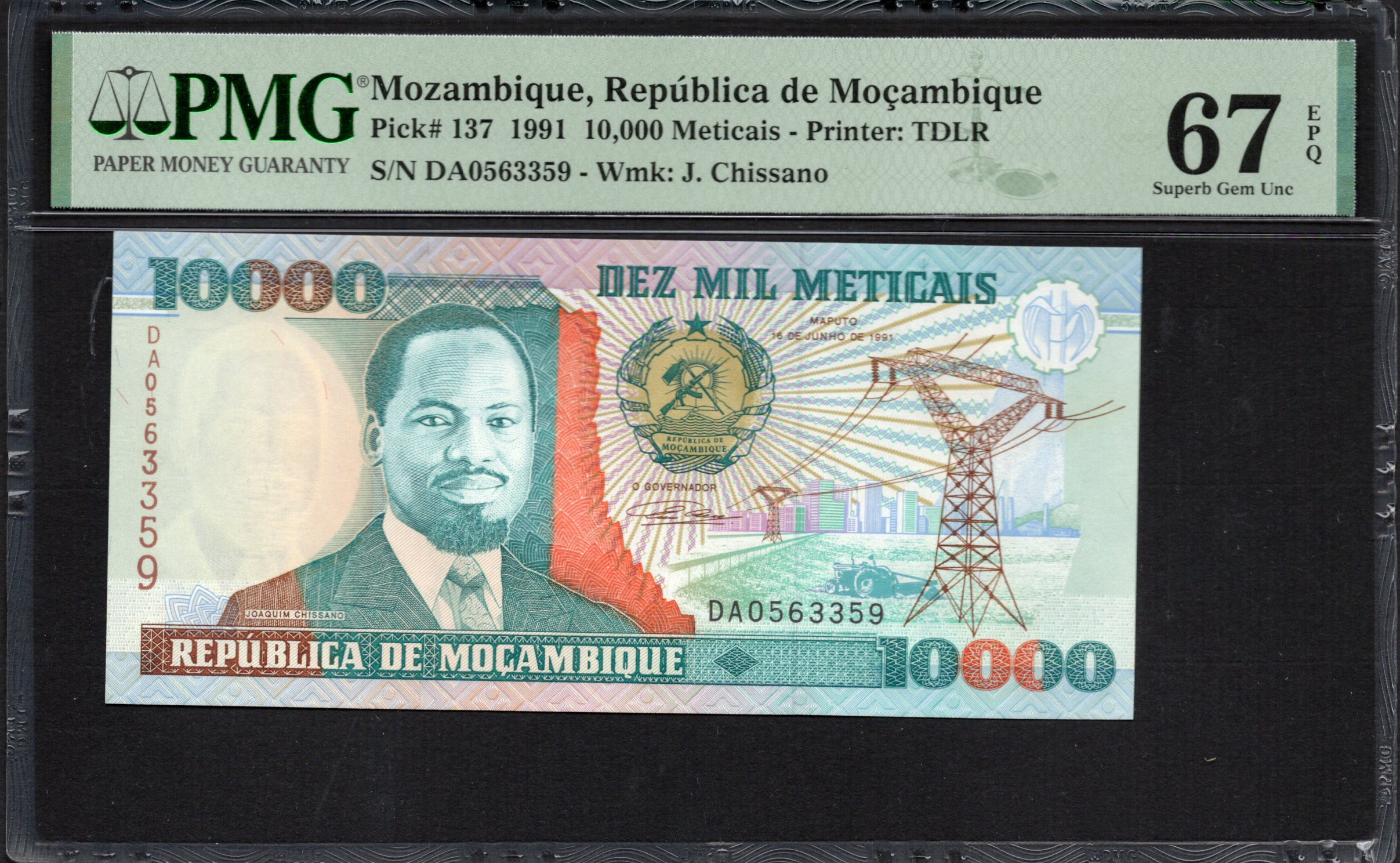 Die Vorderseite des 10.000 Meticais-Scheins zeigt prominent ein Porträt von Joaquim Chissano, der als Präsident von Mosambik diente. Sein würdiger Ausdruck und die detaillierte Darstellung zeigen die Handwerkskunst im Design von Banknoten. Um sein Bild herum finden sich farbenfrohe geometrische Muster in Grüntönen, Orange und Blau. Die Nennwertangabe ist deutlich markiert und sorgt für eine einfache Erkennung. Möglicherweise gibt es ein subtil eingearbeitetes Wasserzeichen als Sicherheitsmerkmal sowie Mikrotexte zur Verhinderung von Fälschungen.