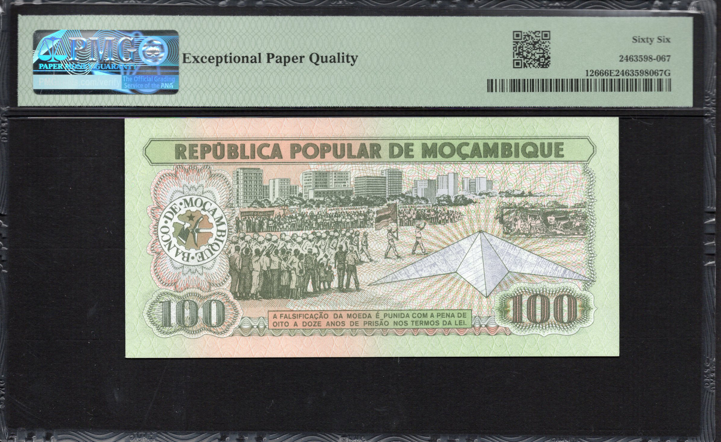 Auf der Rückseite setzt sich das Design mit verzierenden Mustern und zusätzlichen Bildern fort, die das kulturelle Erbe Mosambiks symbolisieren. Die Wörter 'REPUBLICA POPULAR DE MOÇAMBIQUE' sind auffällig dargestellt, zusammen mit der Denomination '100'. Der lebendige grüne Hintergrund hebt die Sicherheitsmerkmale hervor, einschließlich eines holografischen Musters, das die Authentizität erhöht. Die gesamte Ästhetik betont sowohl Funktionalität als auch Kunstfertigkeit, wodurch es eine bemerkenswerte Darstellung des Stolzes der Nation ist.