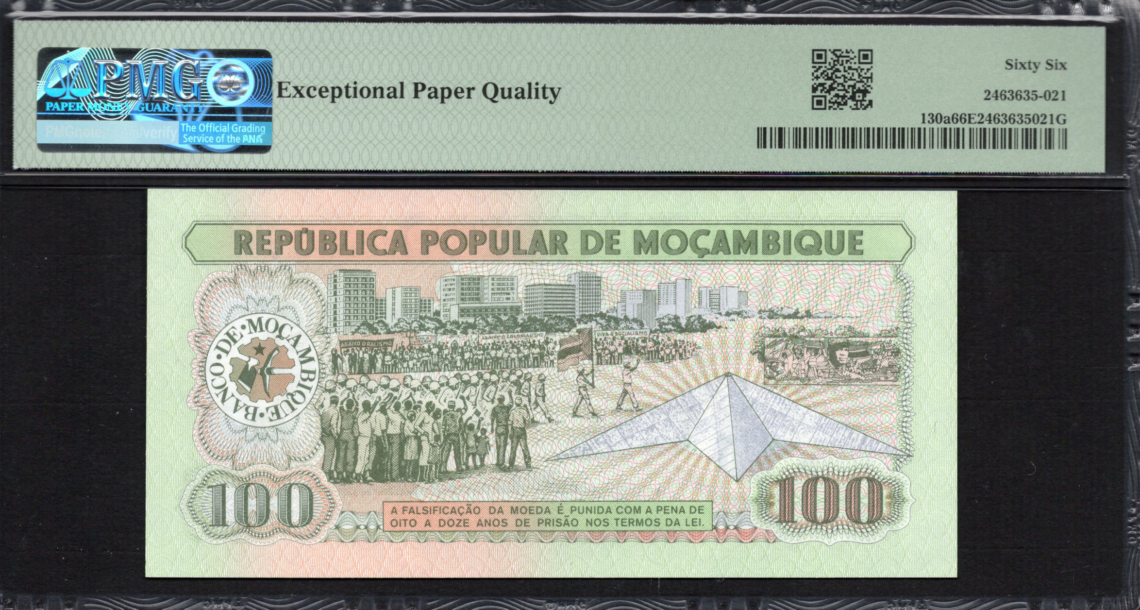 Die 100 Meticais Banknote aus Mosambik, die 1983 ausgegeben wurde, zeigt das historische Erbe und die Werte des Landes. Diese Note enthält wichtige visuelle Elemente, die die kulturelle Identität und Unabhängigkeit Mosambiks widerspiegeln. Die Hauptfarben sind grün und weiß, symbolisch für natürliche Ressourcen und Wachstum. Darüber hinaus heben die komplizierten Designs sowohl künstlerisches Flair als auch Sicherheitsmerkmale hervor, was sie zu einem bemerkenswerten Währungsstück macht.