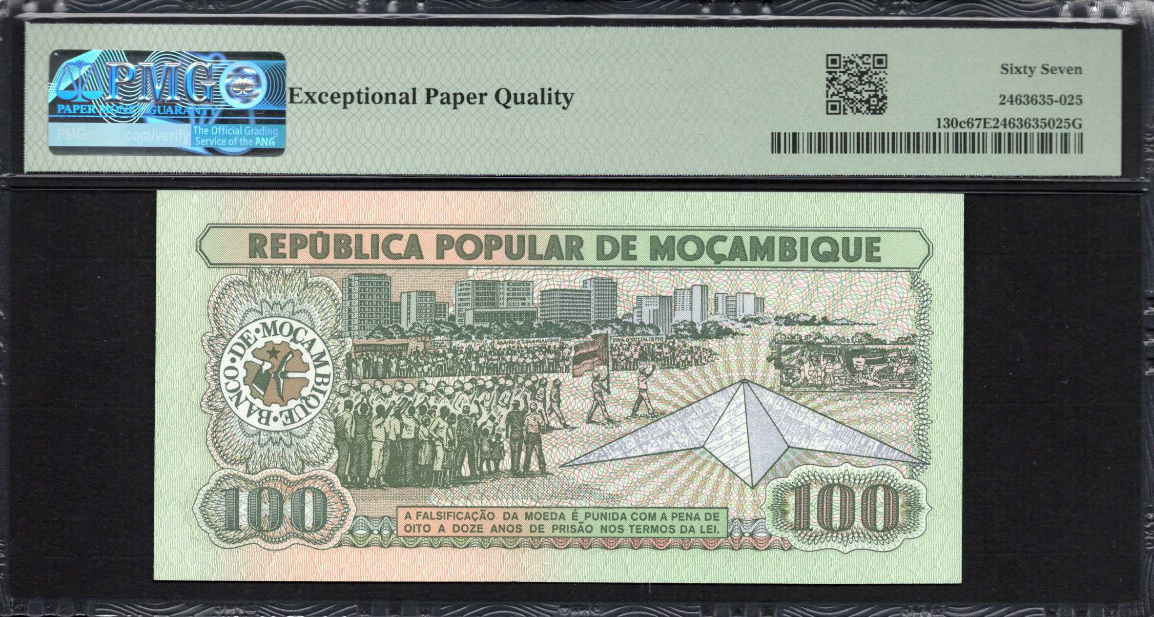 Die Vorderseite des 100 Meticais-Scheins zeigt prominent den Nennwert '100' sowie die Aufschrift 'REPÚBLICA POPULAR DE MOÇAMBIQUE'. Im Zentrum des Designs steht das Porträt einer bedeutenden Persönlichkeit, die wahrscheinlich für Führung oder nationale Stolz steht. Der Hintergrund zeigt stilisierte Darstellungen von Arbeitern und Symbolen der Industrie, die den sozioökonomischen Kontext des Landes verdeutlichen. Darüber hinaus steigern komplexe Muster und subtile Farbverläufe die künstlerische Anziehungskraft. Wichtige Sicherheitsmerkmale umfassen Mikroschrift und ein Wasserzeichen, um den Schein vor Fälschungen zu schützen.