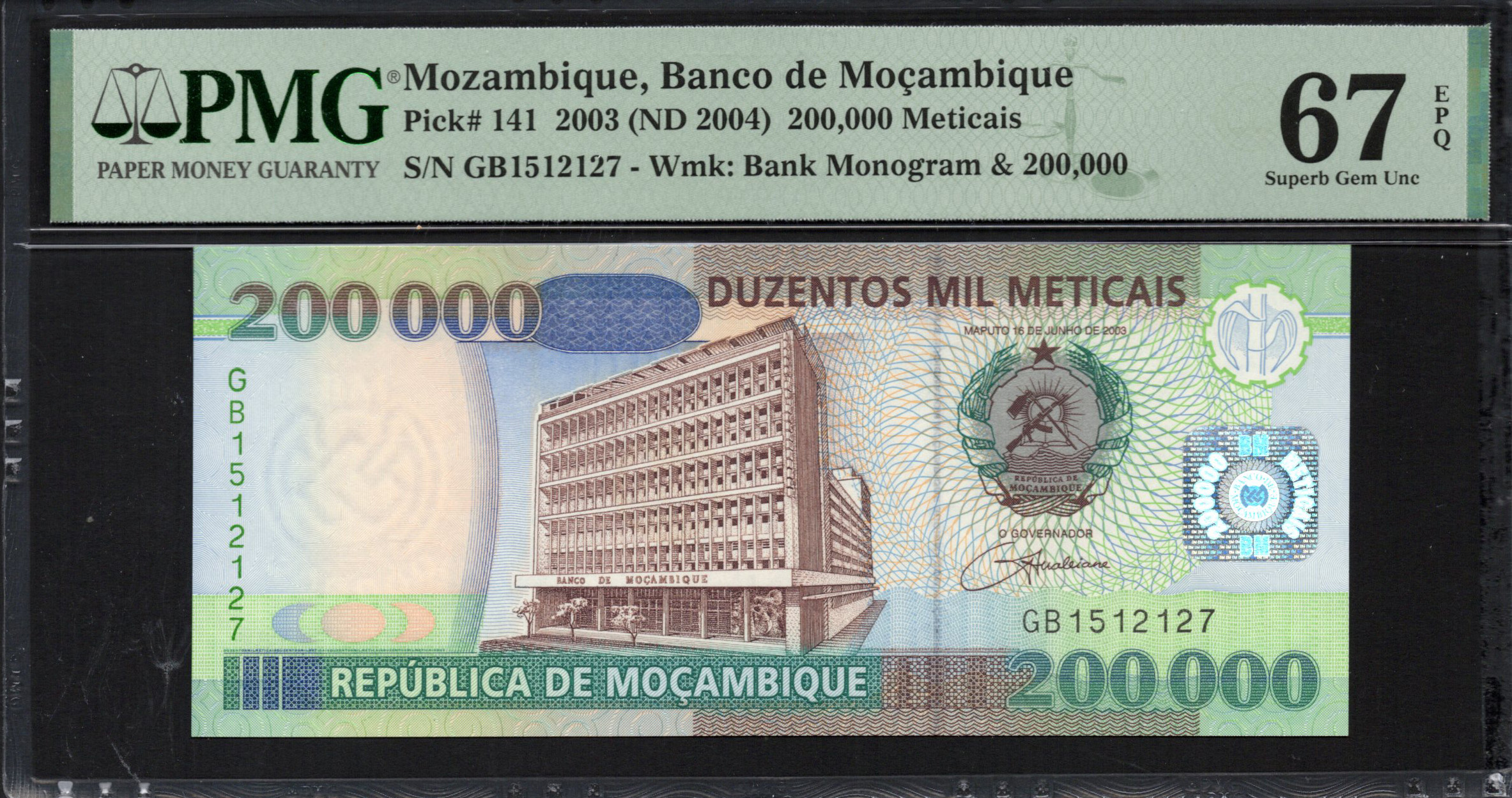Die 200.000 Meticais Banknote aus Mosambik ist bemerkenswert für ihr lebhaftes Design und ihre besonderen Merkmale. Die Vorderseite zeigt prominent das Gebäude der Banco de Moçambique, das die finanzielle Stabilität des Landes symbolisiert. Im Gegensatz dazu hebt die Rückseite das Wappen des Landes sowie verschiedene komplexe Muster hervor, die die lokale Kultur und Kunst widerspiegeln. Die Verwendung von Farben wie Grün und Blau erhöht nicht nur die visuelle Anziehungskraft, sondern hat auch funktionale Zwecke als Teil der Sicherheitsmerkmale.