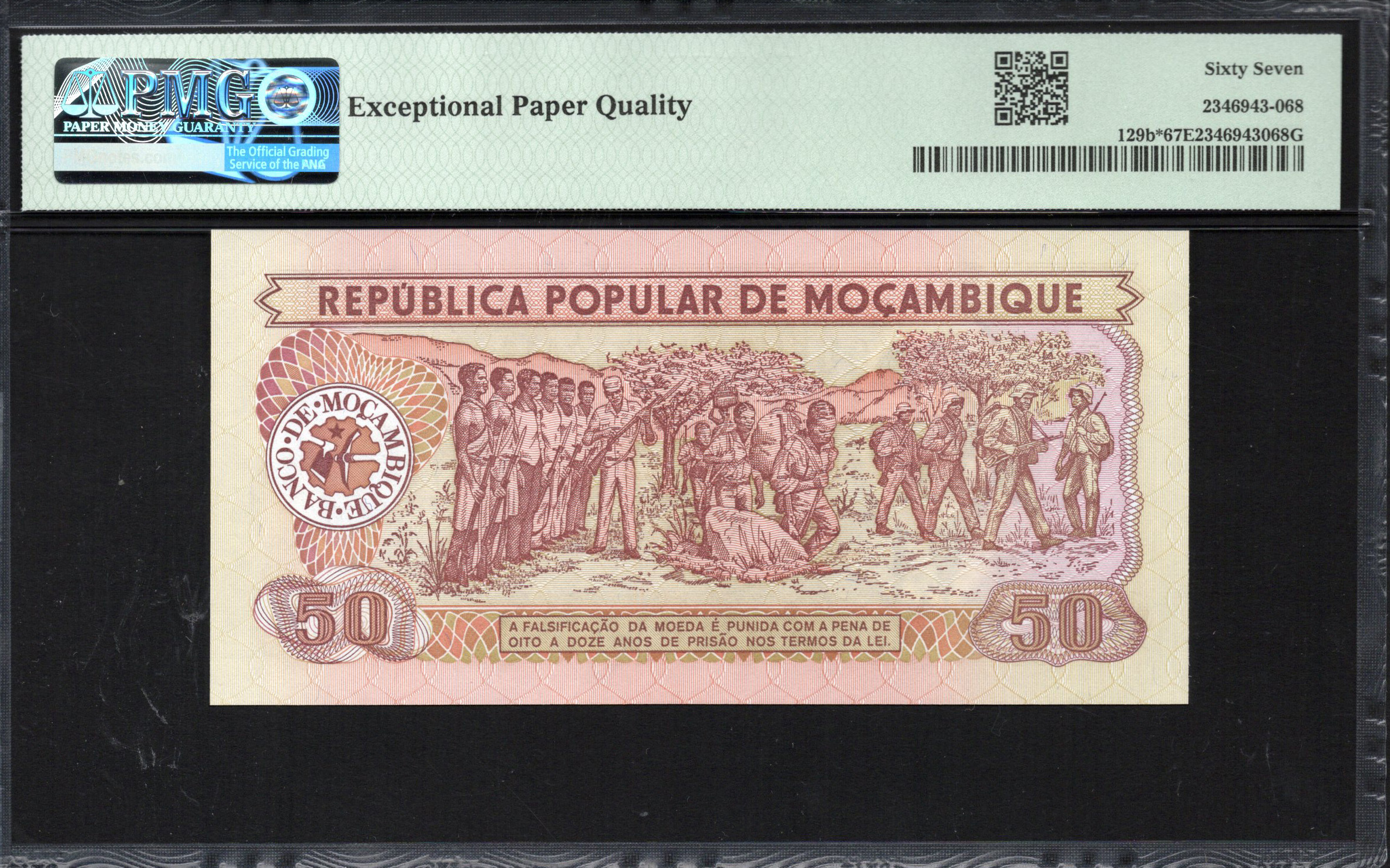 Auf der Rückseite wird das patriotische Thema fortgeführt, indem Soldaten abgebildet sind, die eine Flagge hissen, was den nationalen Stolz weiter stärkt. Im Hintergrund sind möglicherweise bemerkenswerte Wahrzeichen der Architektur Mosambiks abgebildet, die das kulturelle Erbe des Landes symbolisieren. Das Design umfasst subtile Texturen und Muster, die die taktile Interaktion und visuelle Tiefe verstärken. Der Nennwert '50' ist ebenfalls auffällig dargestellt, um eine einfache Identifikation zu gewährleisten. Sicherheitsmerkmale wie ein Wasserzeichen oder ein transparentes Fenster fügen zusätzliche Schutzschichten hinzu. Dieser künstlerische Ansatz kombiniert ästhetische Anziehungskraft mit funktionalen Sicherheitsmaßnahmen, wodurch die Banknote sowohl ein wertvolles Sammlerstück als auch Währung ist.