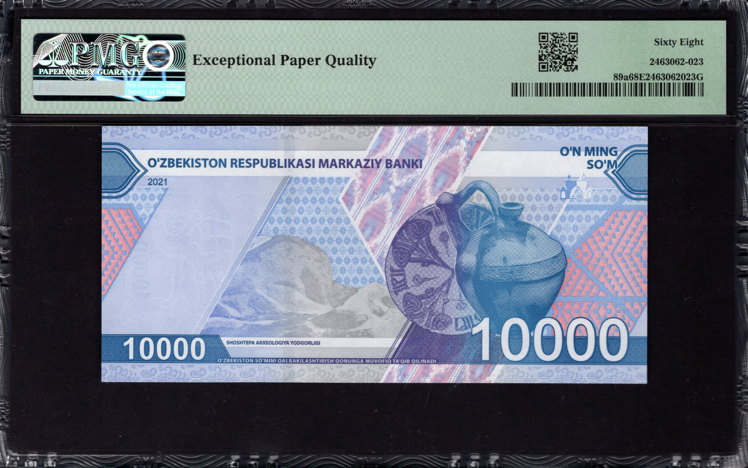 Die Vorderseite der 10.000 Som Banknote wird von einem Bild der Kukeldash Madrasah dominiert, einem wichtigen Bildungs- und spirituellen Zentrum in Taschkent. Das Design nutzt eine harmonische Kombination aus Blau- und Lilatönen und schafft einen visuell ansprechenden Farbverlauf. Zusätzliche dekorative Elemente umgeben das zentrale Bild und zeigen kunstvolle Muster, die das Erbe der usbekischen Kunst widerspiegeln. Sicherheitsmerkmale sind in das Design integriert, einschließlich eines Wasserzeichens und Mikroschrift, um die Authentizität der Banknote zu gewährleisten und dabei die ästhetische Qualität zu erhöhen.