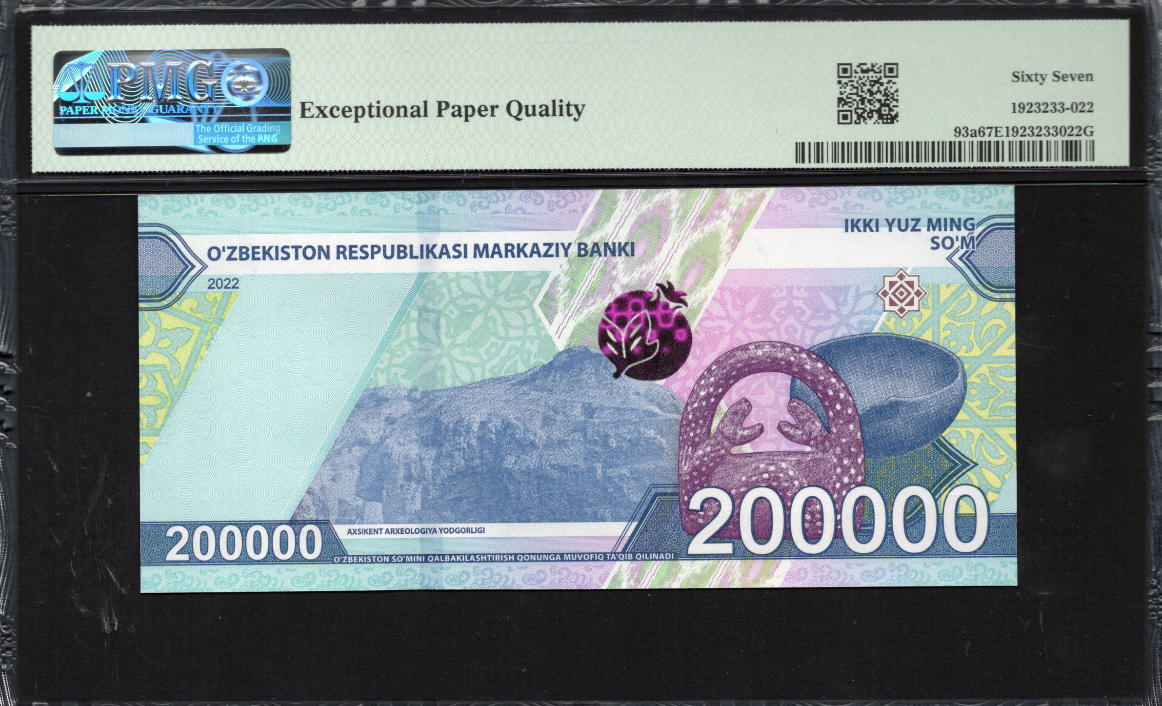 Der präsentierte Geldschein ist ein usbekischer 200.000 Som-Schein, der mit komplizierten Designs und lebendigen Farben versehen ist. Der Geldschein zeigt bedeutende kulturelle und historische Elemente, die das reiche Erbe Usbekistans widerspiegeln. Die Vorderseite hebt architektonische Bilder mit lebhaften Mustern und Sicherheitsmerkmalen hervor, die Fälschungen verhindern sollen. Er dient nicht nur als Währung, sondern auch als ein Kunstwerk, das die Identität der Nation verkörpert.