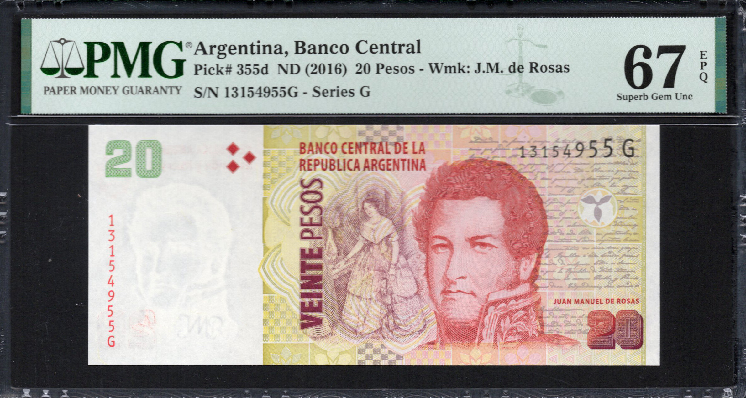 Argentina - 20 Pesos 2016 - Pick # 355d - PMG 67 EPQ