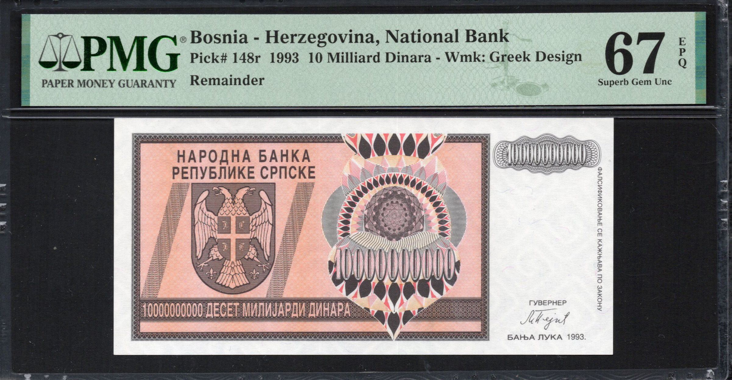 Bosnia and Herzegovina - 10 Milliard Dinara 1993 - Pick # 148r - PMG 67 EPQ