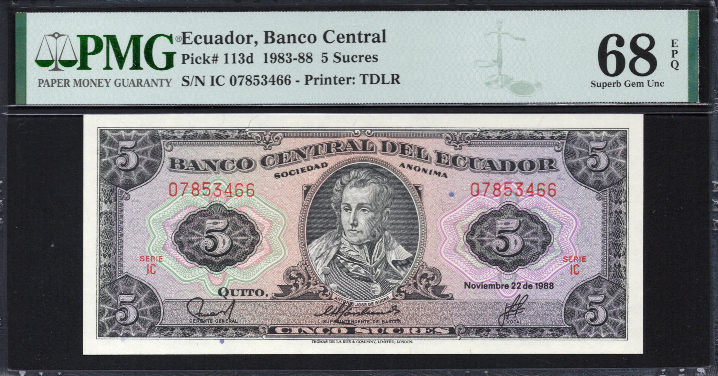 Ecuador - 5 Sucres 1983 - Pick # 113d - PMG 68 EPQ