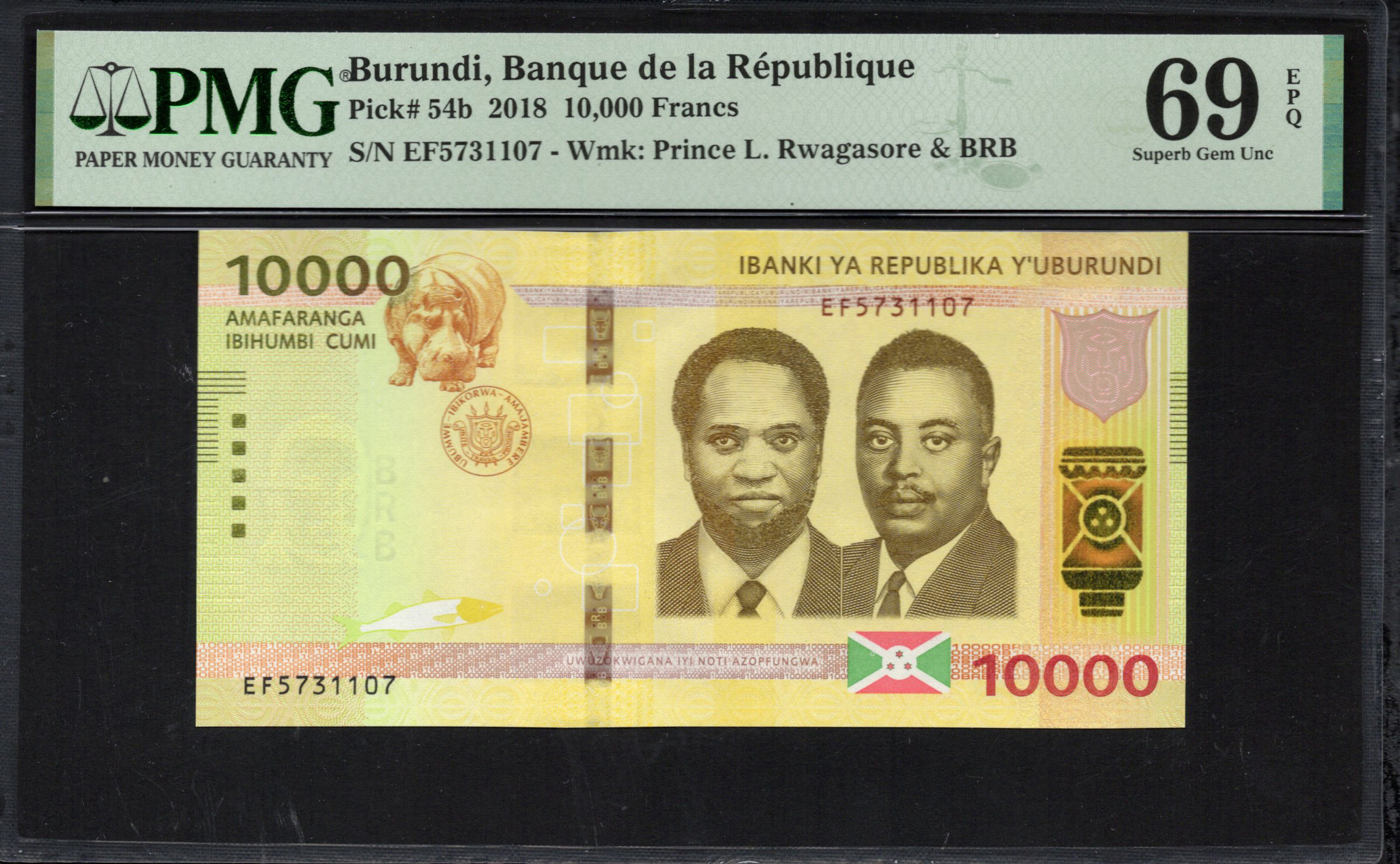 This 10,000 Francs banknote from Burundi showcases intricate designs and significant cultural symbols. The front features portraits of prominent figures, highlighting the nation's heritage, while the vibrant colors and patterns reflect Burundian artistry. Additionally, the banknote includes security features such as a watermark and microtext that enhance its authenticity. On the back, the imagery represents national pride and biodiversity, including an illustration of a hippo and other local elements, capturing the essence of Burundi's landscape.