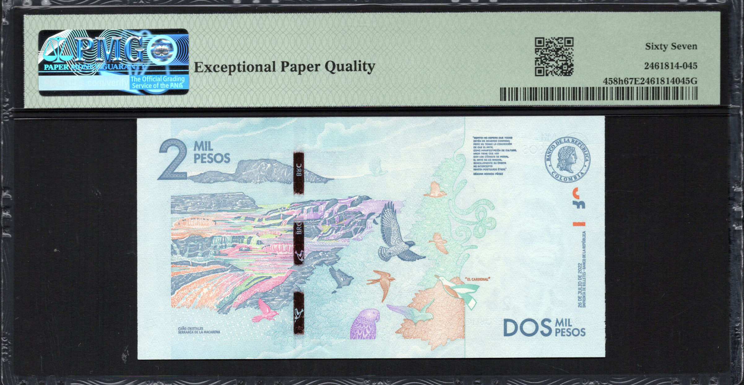 The back of the banknote presents additional design elements that complement the front. It features colorful geometric patterns interwoven with representations of Colombia's biodiversity. Among these, a prominent depiction of the Andean condor can be seen, enriching the narrative of Colombia's natural heritage. Additionally, safety features such as microprint text and a colored thread can be identified, which are crucial for preventing counterfeiting. The overall color scheme remains consistent with the front, creating a harmonious aesthetic that is pleasing to the eye.