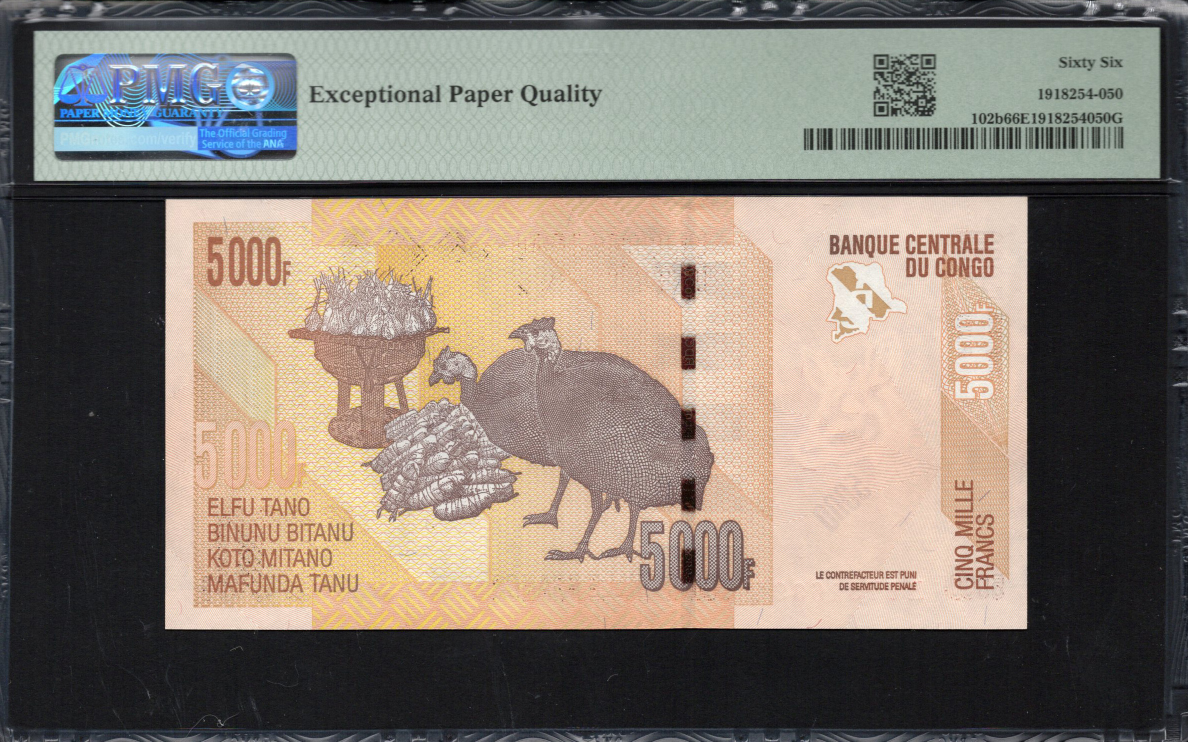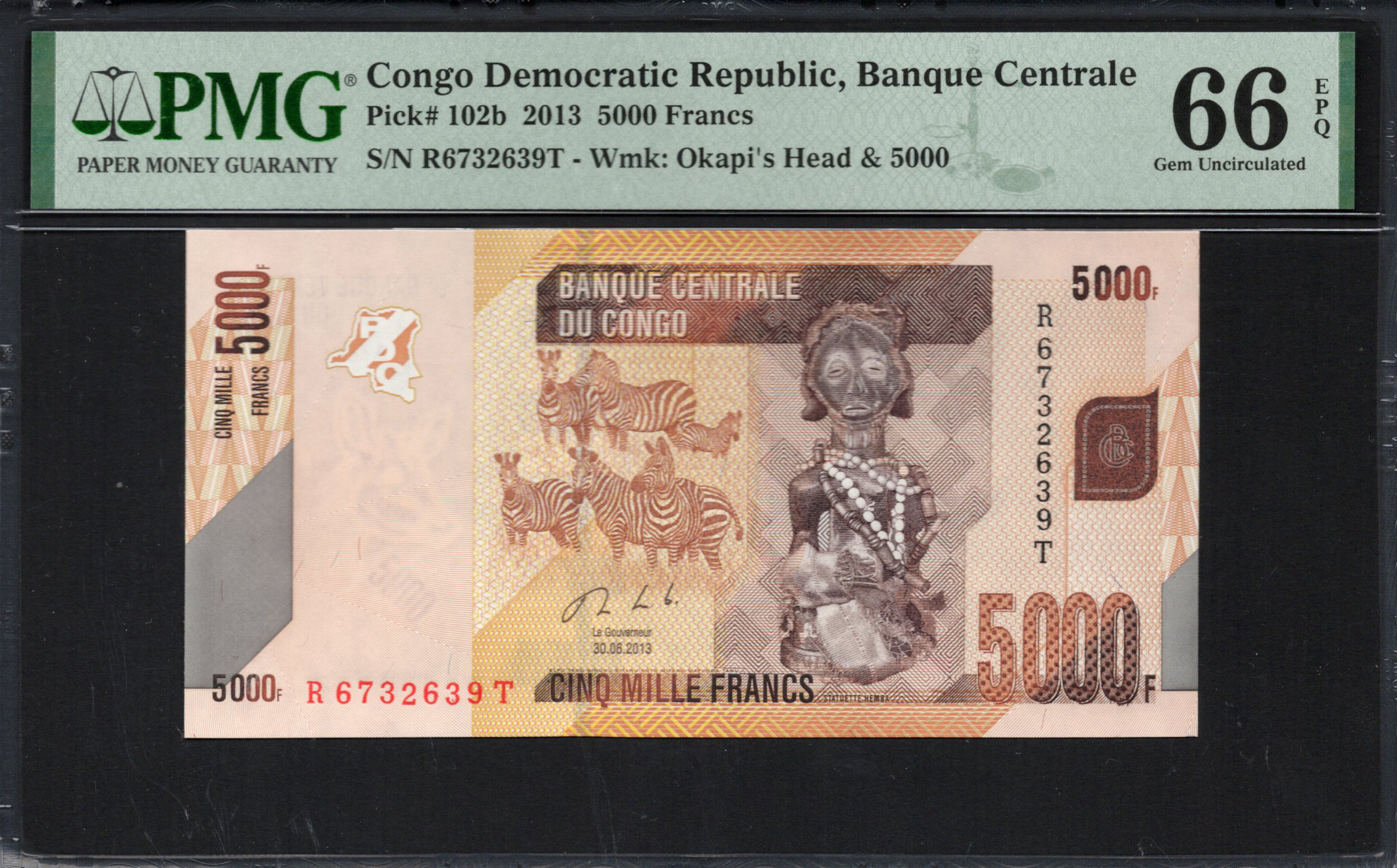 The front side of the 5000 Franc note features a colorful depiction of zebras alongside an image of a tribal figure adorned with traditional jewelry and artifacts. The vibrant colors, including orange and yellow hues, create a strong visual impact. Security features include a watermark of the Okapi and microprinting along the borders, making it difficult to counterfeit. The denomination is clearly displayed, emphasizing its worth.