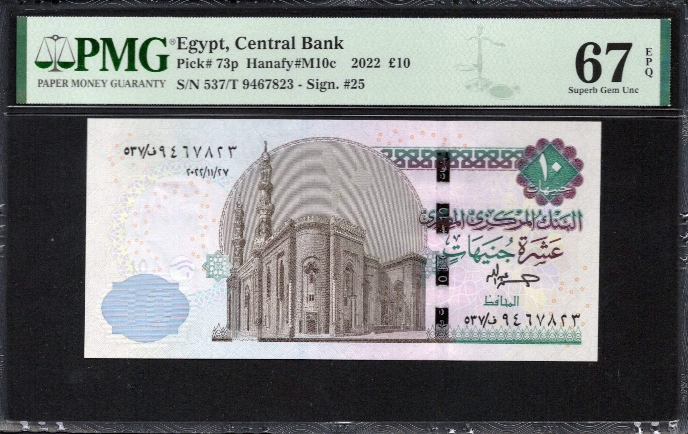 This Egyptian banknote, issued by the Central Bank, showcases exquisite artistry reflecting the nation’s cultural heritage. The bill features intricate designs and security features that highlight its value. The front side prominently displays a historic building, denoting significance in Egyptian architecture, while the back features a detailed portrayal of significant elements and motifs. The use of colors, especially purple and mint green, adds to its visual appeal. Security features, such as watermarks and holographic elements, ensure the banknote's authenticity, making it a fascinating example of currency design.