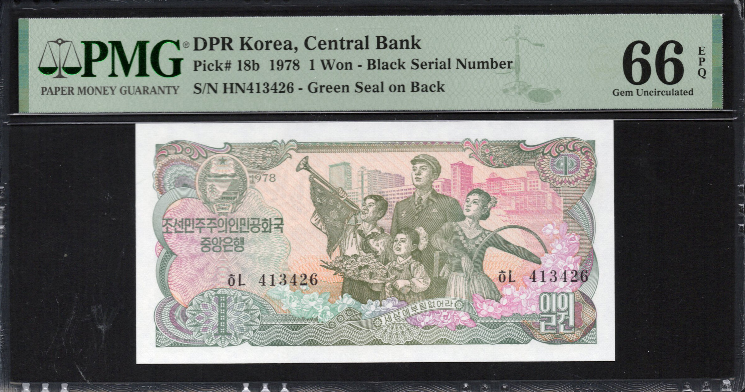 The front of the 1 Won banknote presents a striking depiction of a group of individuals engaged in various labor activities, indicative of the socialist themes prevalent in North Korean currency. The note is colored in shades of green and pink, creating a visually appealing contrast. Noteworthy is the inclusion of buildings in the background, which symbolizes industrial development. The banknote also features a serial number in black and various artistic patterns that add to its authenticity. The year 1978 is prominently displayed, providing historical context.