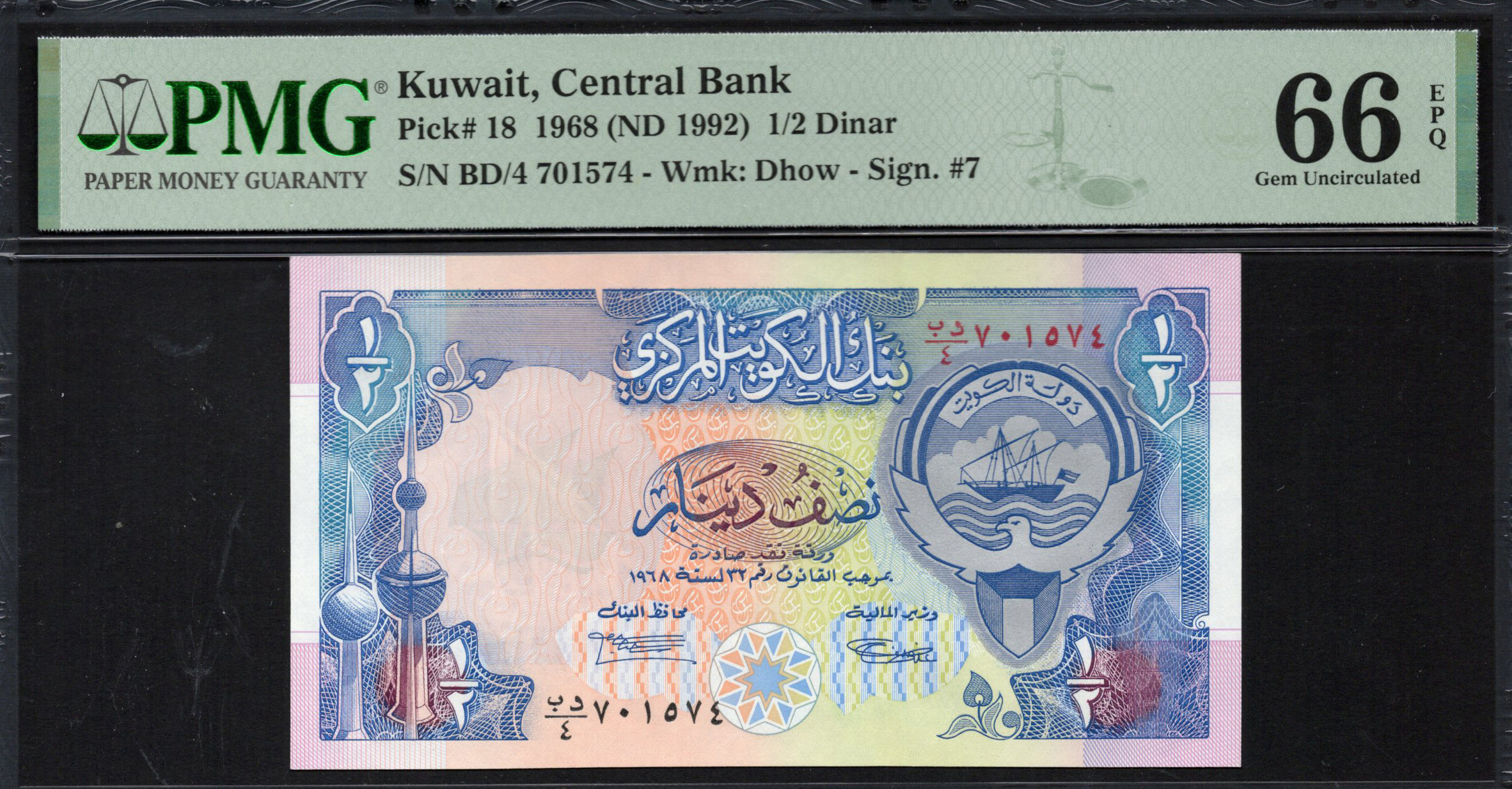 The 1/2 Dinar banknote of Kuwait showcases intricate designs reflecting the rich heritage and culture of the nation. Issued by the Central Bank of Kuwait in 1968, this banknote features a blend of vibrant colors and symbolic imagery, including the traditional dhow, which represents Kuwait's maritime history. The use of both Arabic and English inscriptions adds a layer of accessibility, while security features ensure the note's integrity. Recognized by the PMG grading system, this note is a collector's dream, presenting not only its monetary value but also its artistic aesthetic.