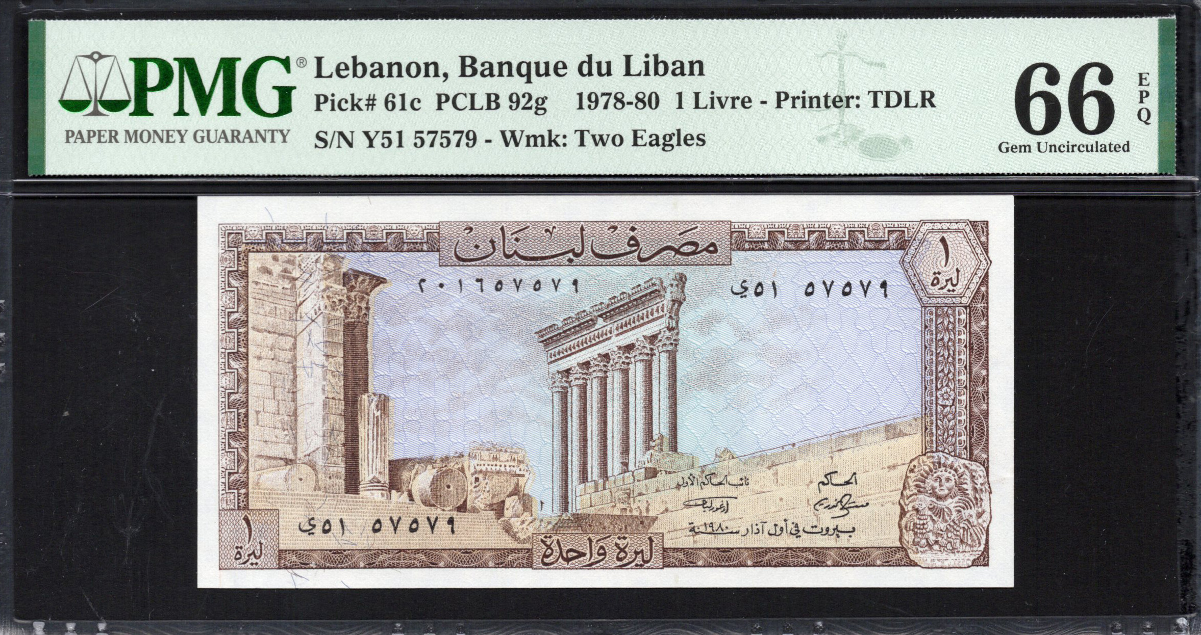 The front of the 1 Livre banknote features a detailed illustration of ancient architecture, including Corinthian columns and stonework that exemplify Lebanese historical sites. The dominant colors on this side include soft browns and faint blues, creating a harmonious appearance. A watermark of two eagles can be seen, symbolizing strength and resilience. Microprinting and intricate patterns are integrated into the design, providing both aesthetic appeal and security against forgery. The denomination and issuing authority are prominently displayed, reinforcing its legitimacy.