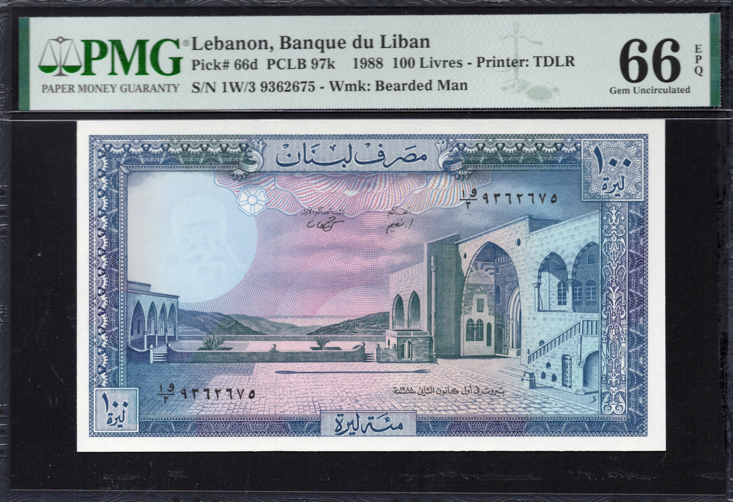 The 100 livres banknote from Lebanon features a striking blend of artistic elements and security features. Issued in 1988, this note showcases intricate designs that reflect Lebanese culture and heritage. The front displays a beautifully colored depiction of historical architecture set against a serene backdrop, complemented by a soft gradient of blue and purple hues. Notably, the mention of the bank and denomination is prominent, with clear microtext enhancing its authenticity. The reverse side often includes visual motifs related to national pride. This banknote represents a significant piece of Lebanon's monetary history.