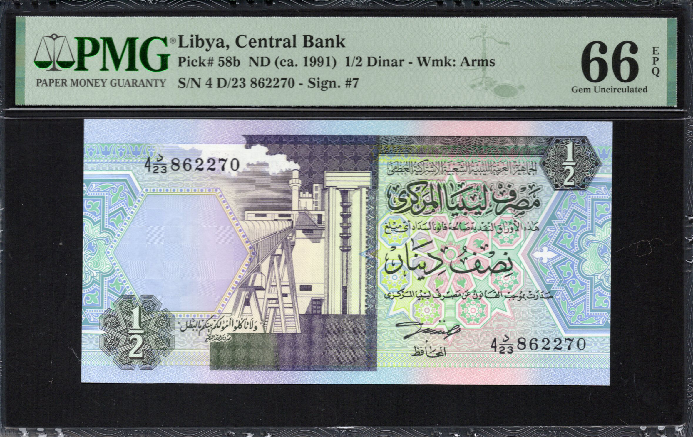 This analysis provides insights into a Libyan 1/2 Dinar banknote, showcasing its unique design and security features. The note, produced by the Central Bank of Libya in 1991, features both artistic elements and critical security attributes. The front displays a captivating blend of colors and intricate patterns, while the back highlights essential symbols reflective of Libya’s cultural heritage. This detailed examination will enhance your understanding of the note's significance in monetary history.